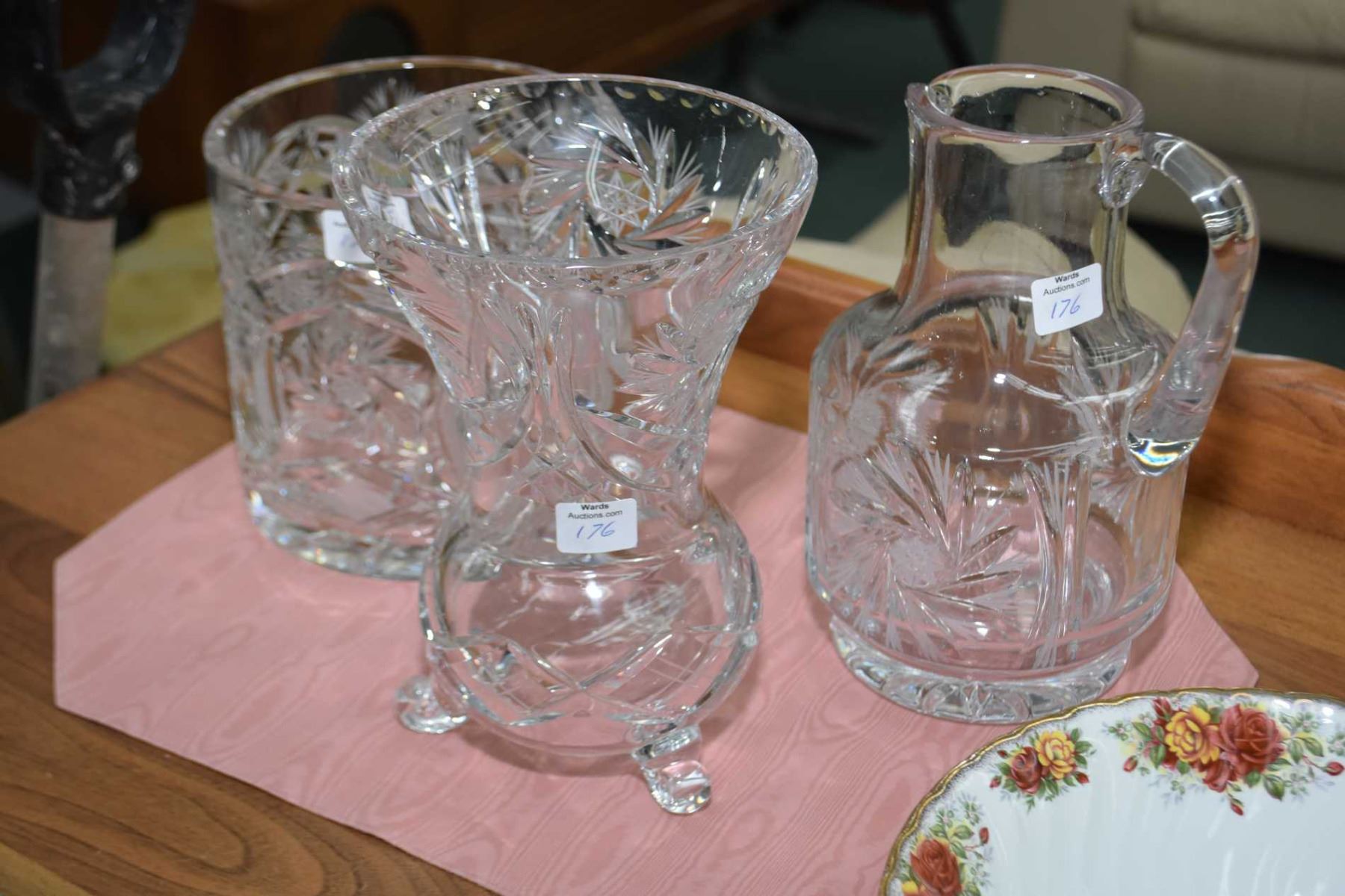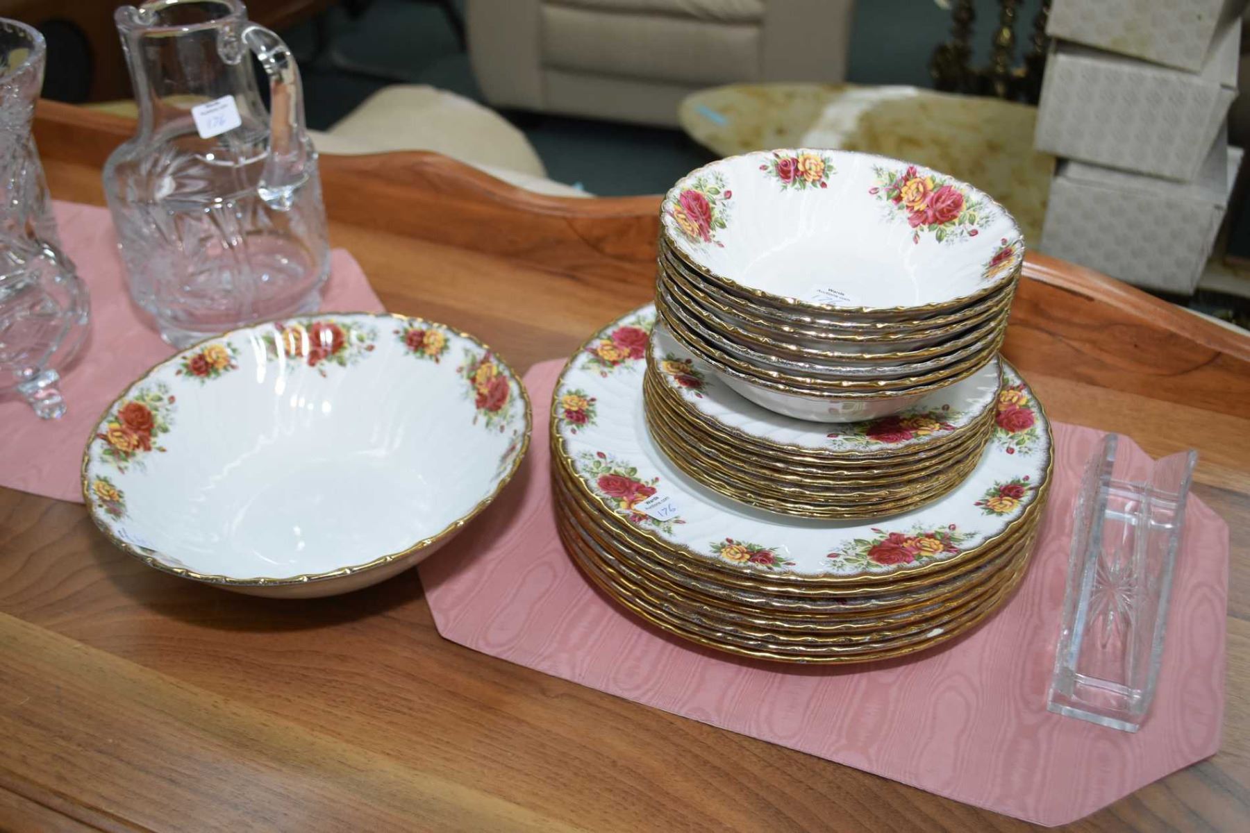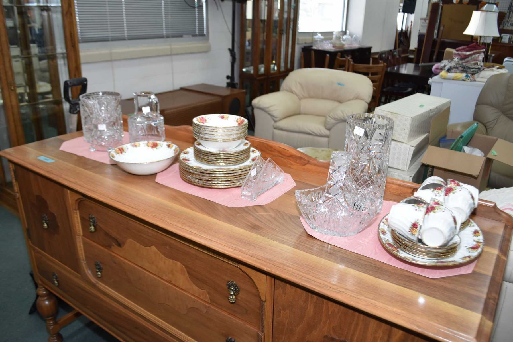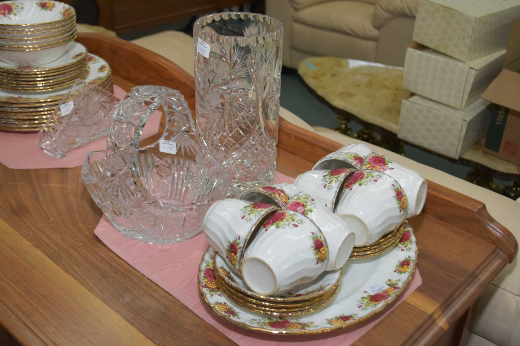 This item is not available for shipping. Local pickup only. Selection of Aynsley stoneware china including settings for eight of dinner plates, sandwich plates, teacups and saucers plus seven cereal bowl, large open vegetable dish and a platter plus a selection of crystal including water jug, footed vase, crystal ice bucket, handled basket, cylinder vase and a napkin holder