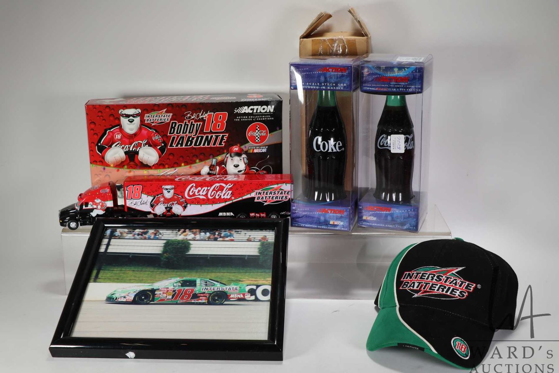 Selection of Bobby Labonte/ Tony Stewart collectibles including 1: 64 scale limited edition semi truck and trailer, two Coca Cola 2001 Polar bear bottles, a Interstate Batteries hat and a 9" X 11" framed photo