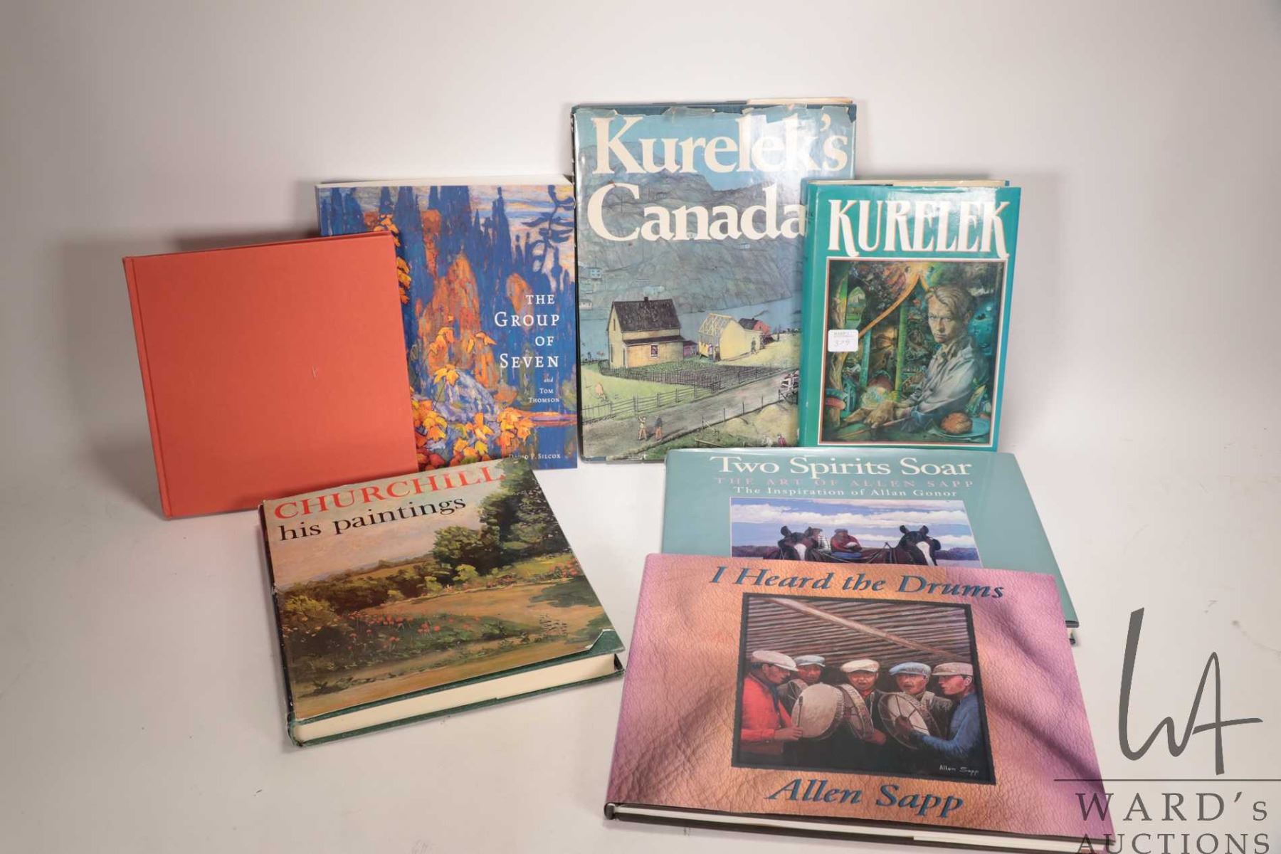 Selection of Books on Canadian Artists including Allen Sapp "I Heard the Drums" and "Two Spirits Soar", 2 hard cover books on Kurelek including Biography by Patricia Morley, The Group of Seven and Tom Thomson by David P. Silcox, The Best of Tom Thomson by Murray, and Churchill His Paintings by David Coombs, foreword by Lady Spencer-Churchill