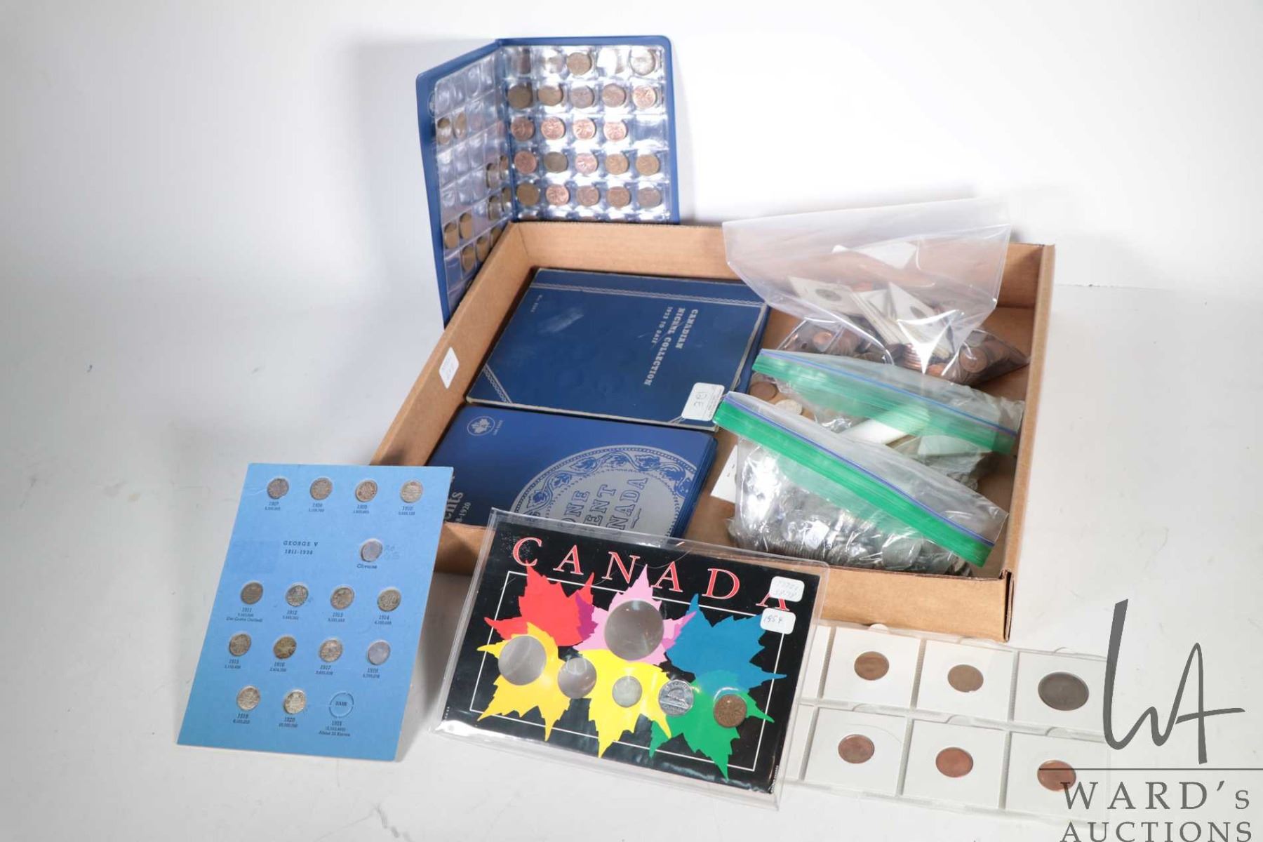 Selection of Canadian coins including pennies, nickels and dimes, various years, some with cardboard holders