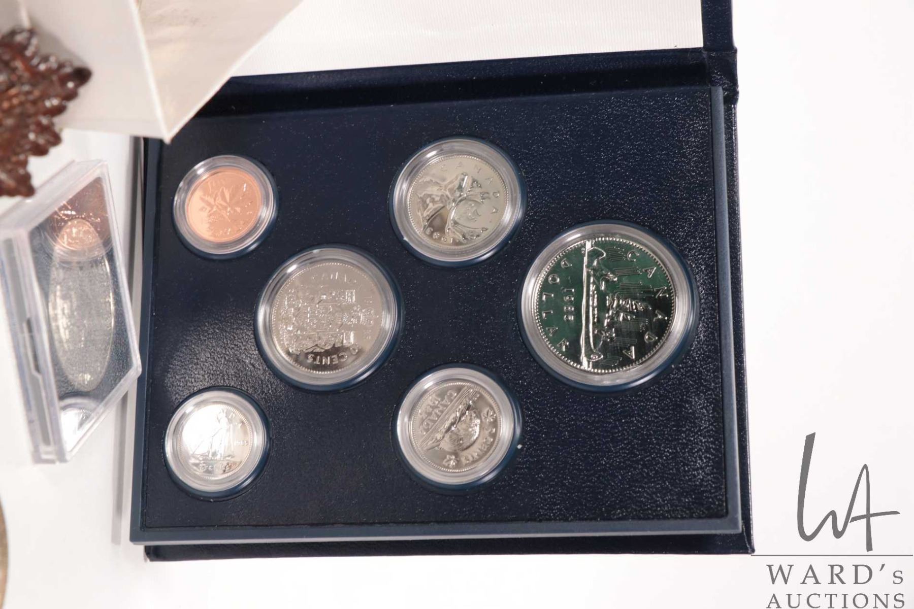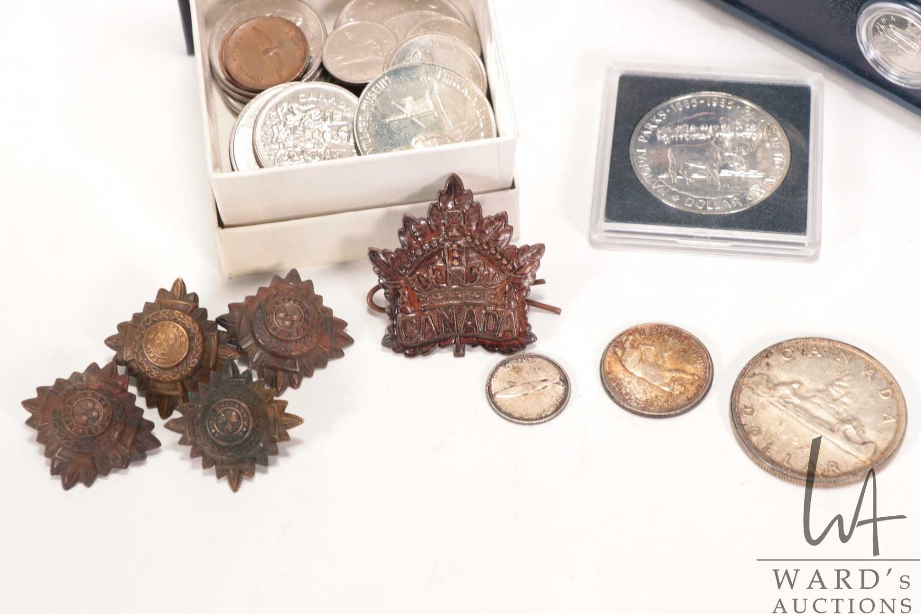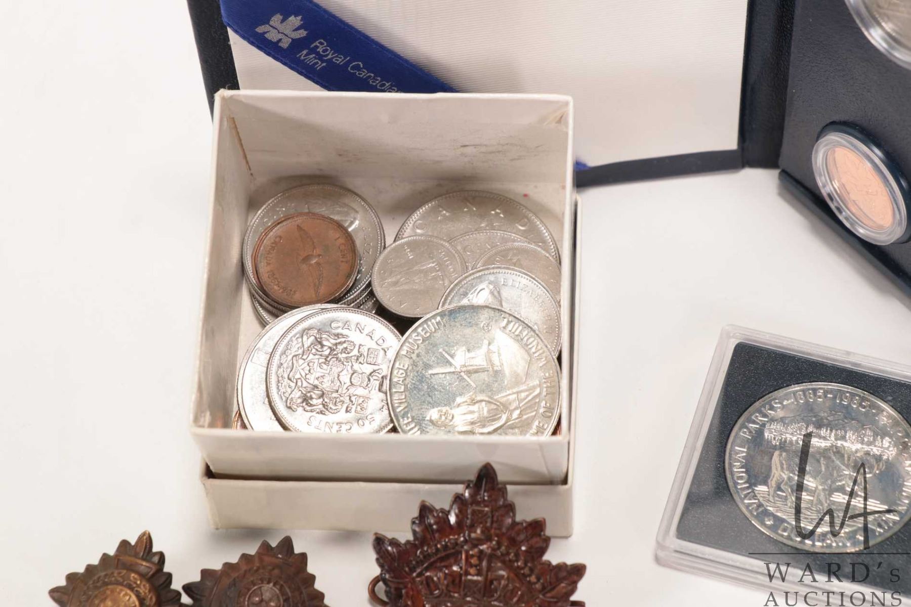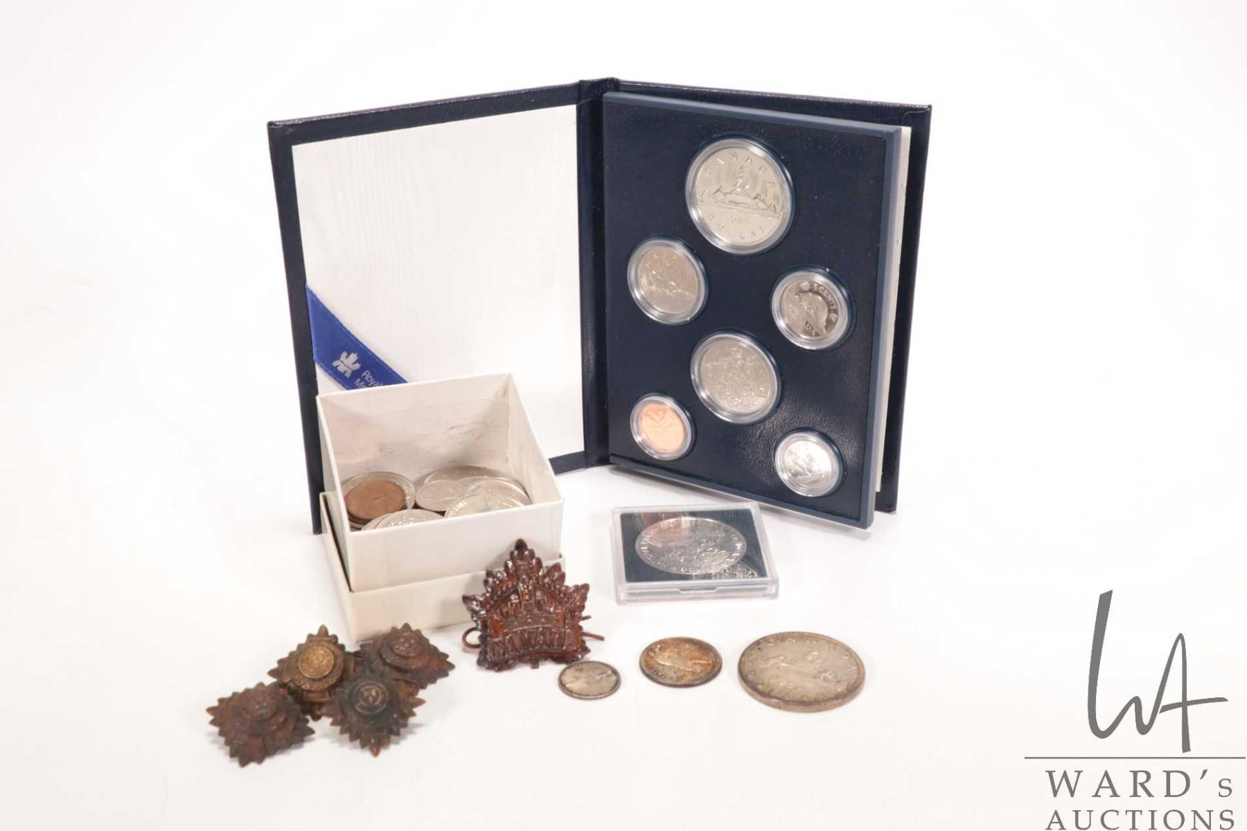Selection of Canadian collectible coins including 1959 silver dollar, 1967 silver quarter and dime, a 1885-1985 National Parks silver dollar, a 1985 Royal Canadian mint coin set, box with assorted one dollar and half dollar coins plus selection of Canadian pins and a badge