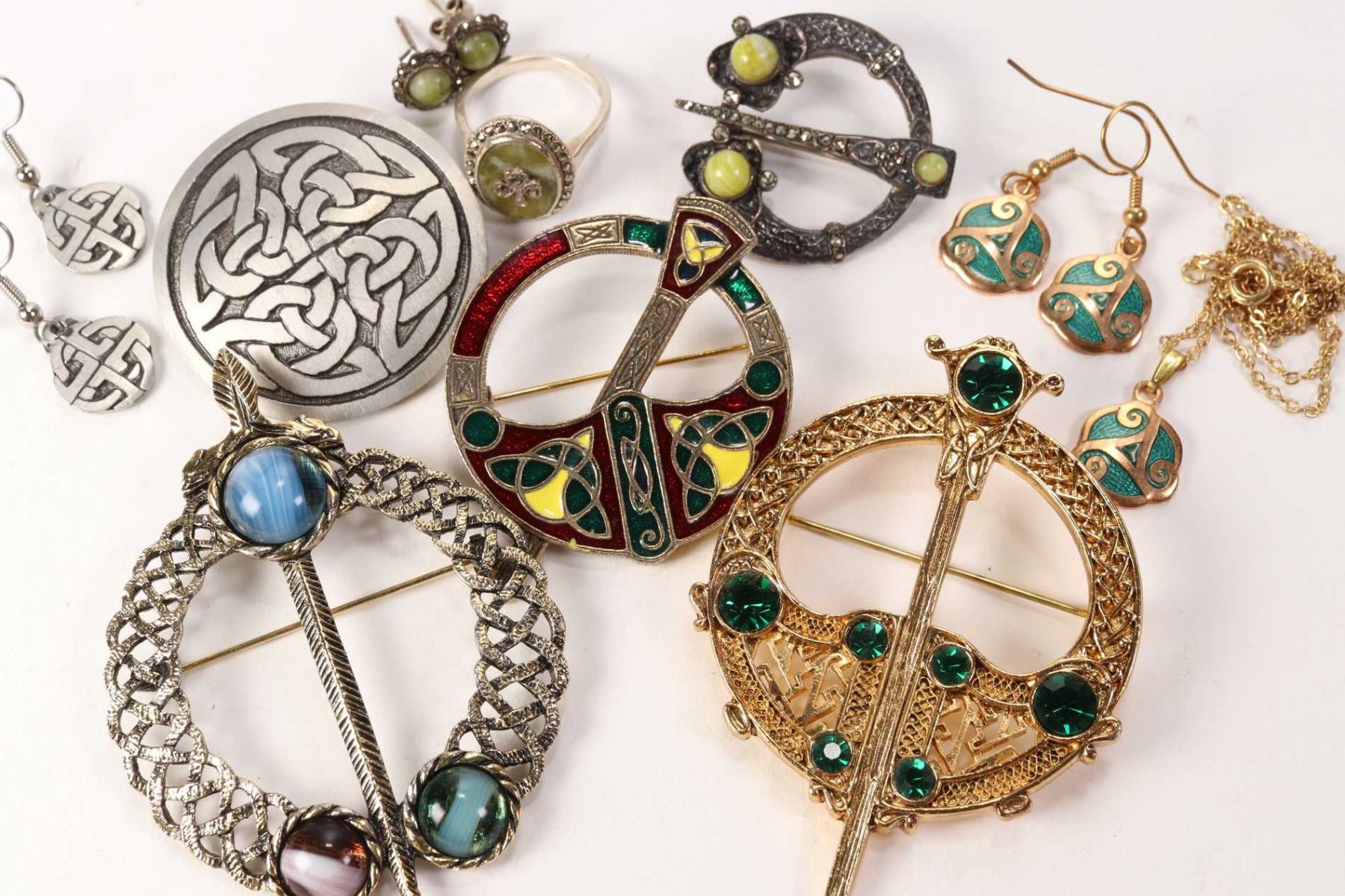 Selection of Celtic themed jewellery including pins, enamelled pendant and earrings, Scottish green stone and marcasite brooch and earrings plus a sterling silver, maracasite and Scottish green stone ring etc.