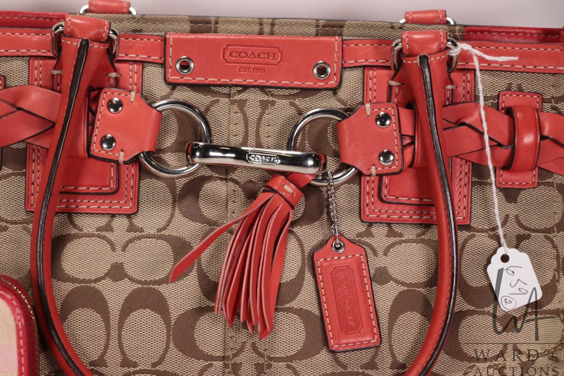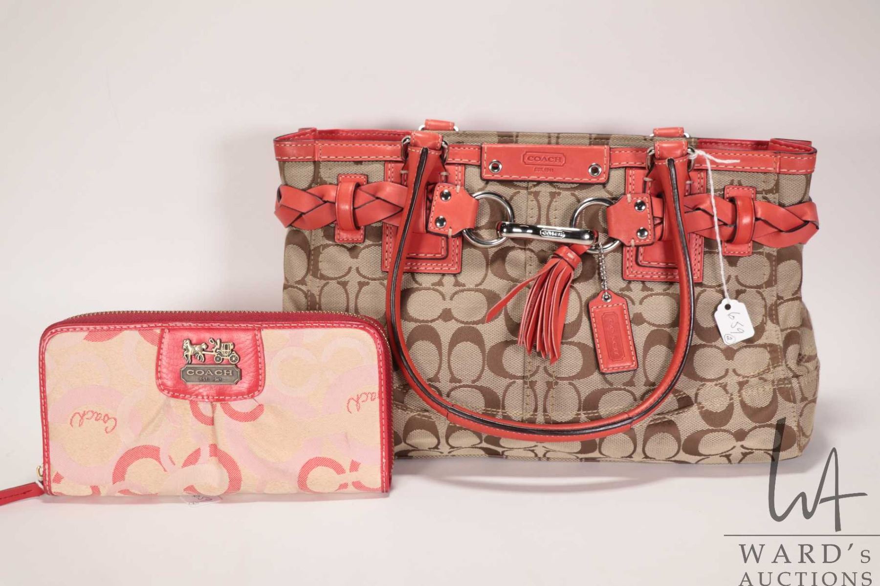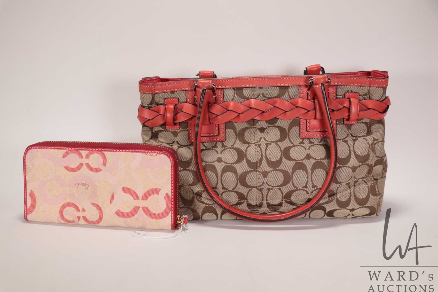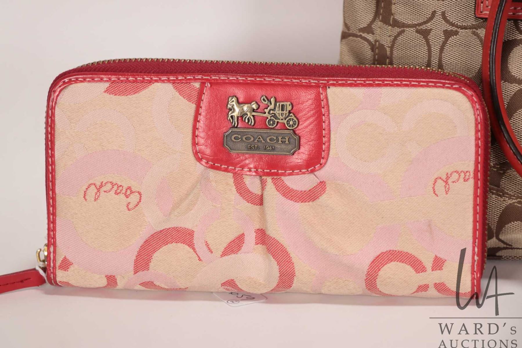 Selection of Coach purses and wallets including Hampton Signature beige canvas, serial no. F15665 and a Madison Op Art clutch wallet in pink and tan