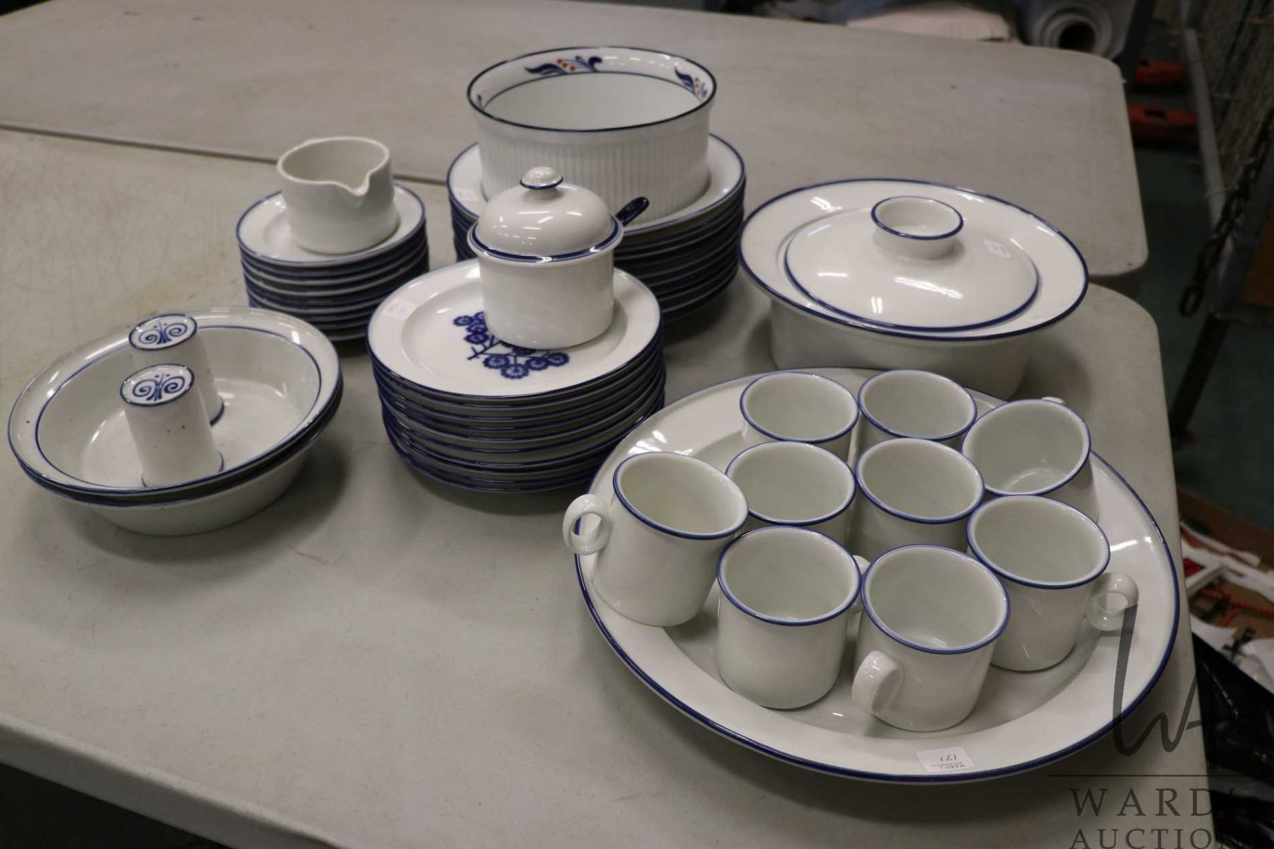 Selection of Dansk Design Norway tableware including ten each of 10" dinner plates, 8" plates, nine teacups and saucers, 11" lidded casserole dish, 14" round platter, lidded spooner and cream jug and a large souflfle dish plus two unmarked serving bowls and a set of shakers
