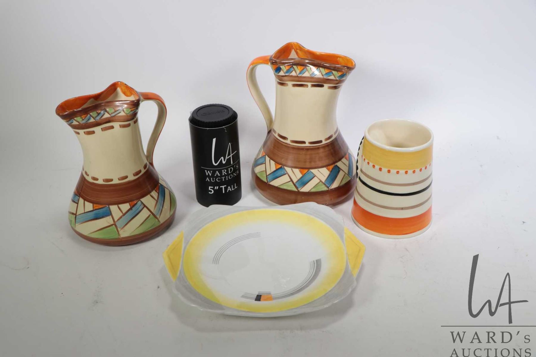 Selection of Deco era porcelains including two hand painted Myott & Sons pitchers, one 7 1/2" and on 8" in height, a Susie Cooper Production mug and a Shelley snack plate