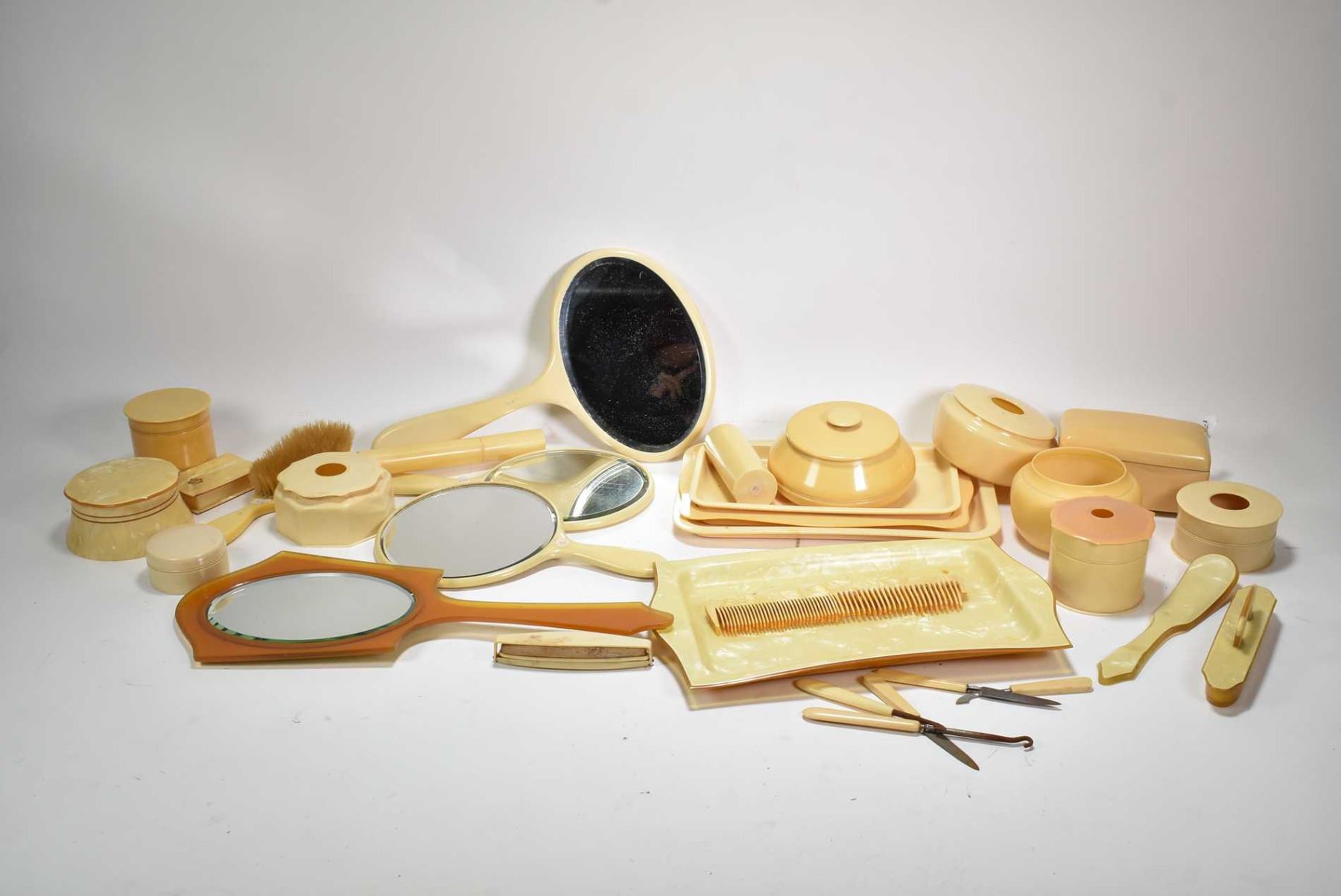 Selection of French ivory including dresser trays, hair brushes, mirrors, hair receiver, nail tools, lidded powder jars etc.