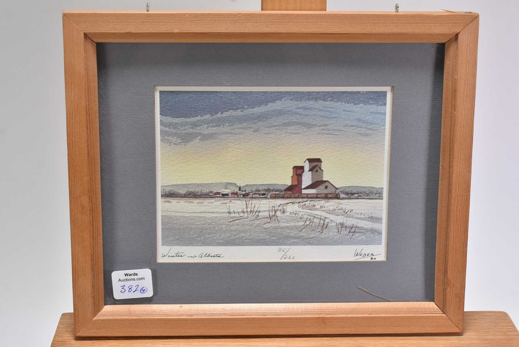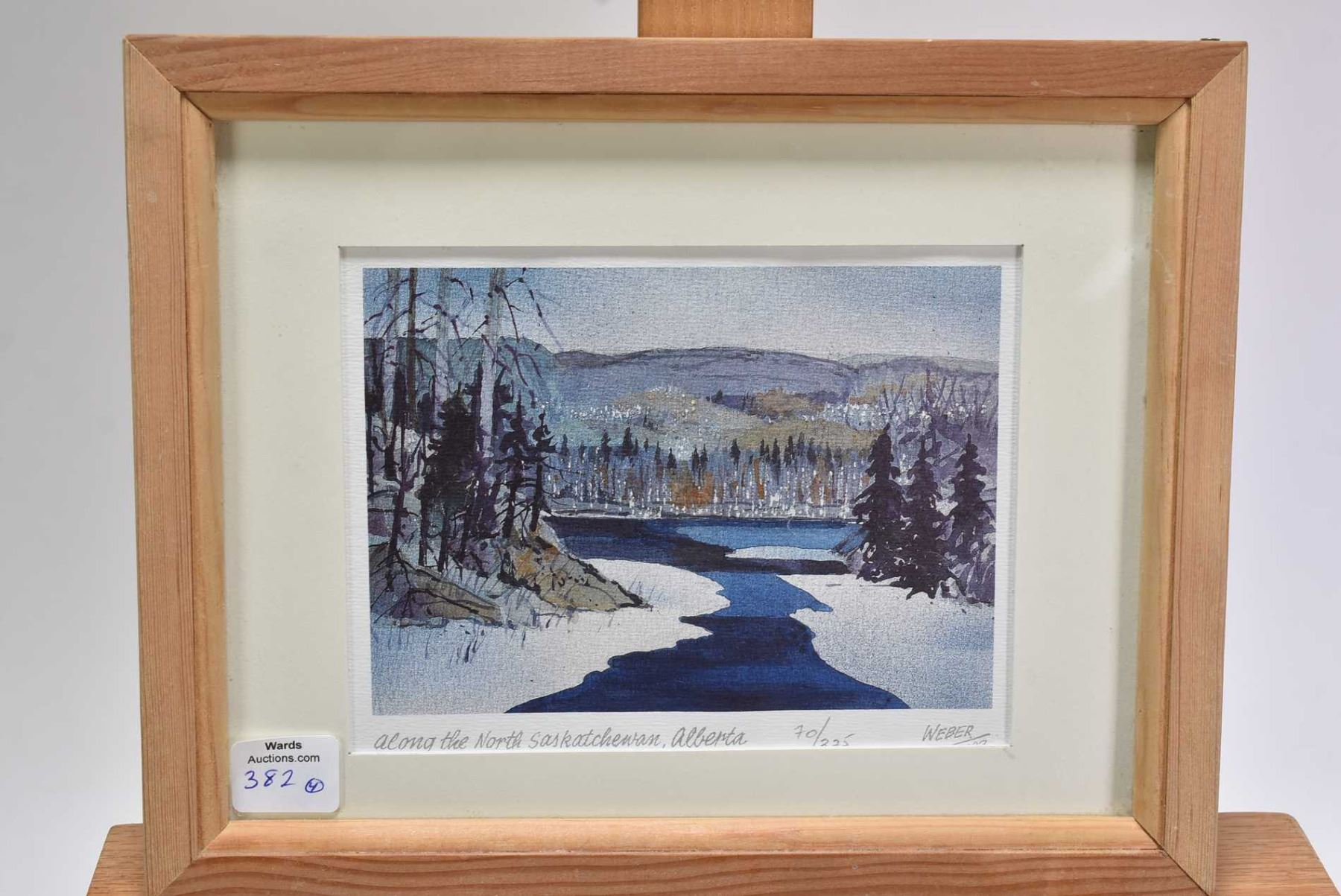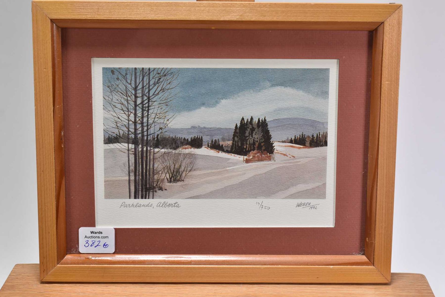 Selection of George Weber artwork including original watercolour painting titled "Winter Feed Lot, Rimbey"5" X 6" and three limited edition prints including "Parkland's Alberta", 19/750, "Winter in Alberta", 35/250 and "Along the North Saskatchewan, Alberta", 70/225