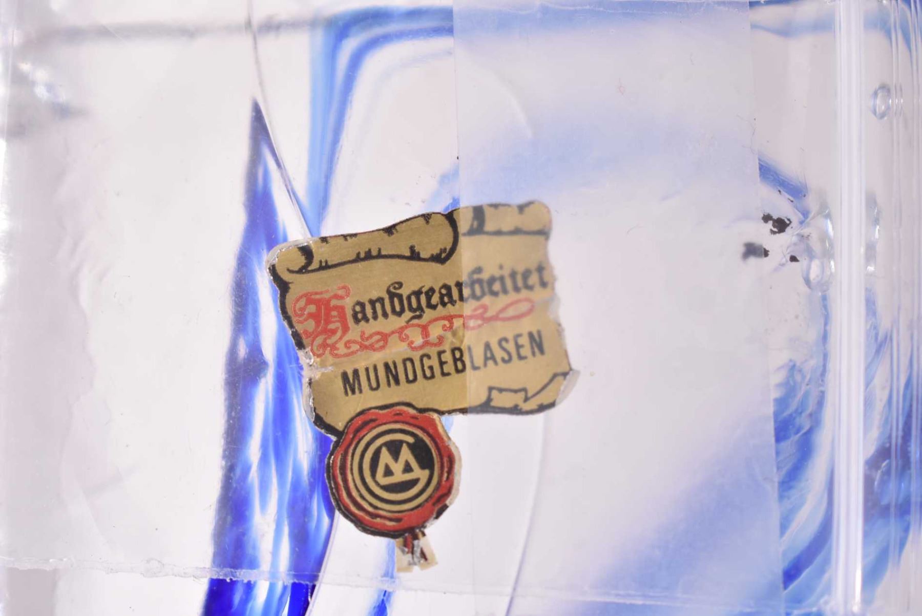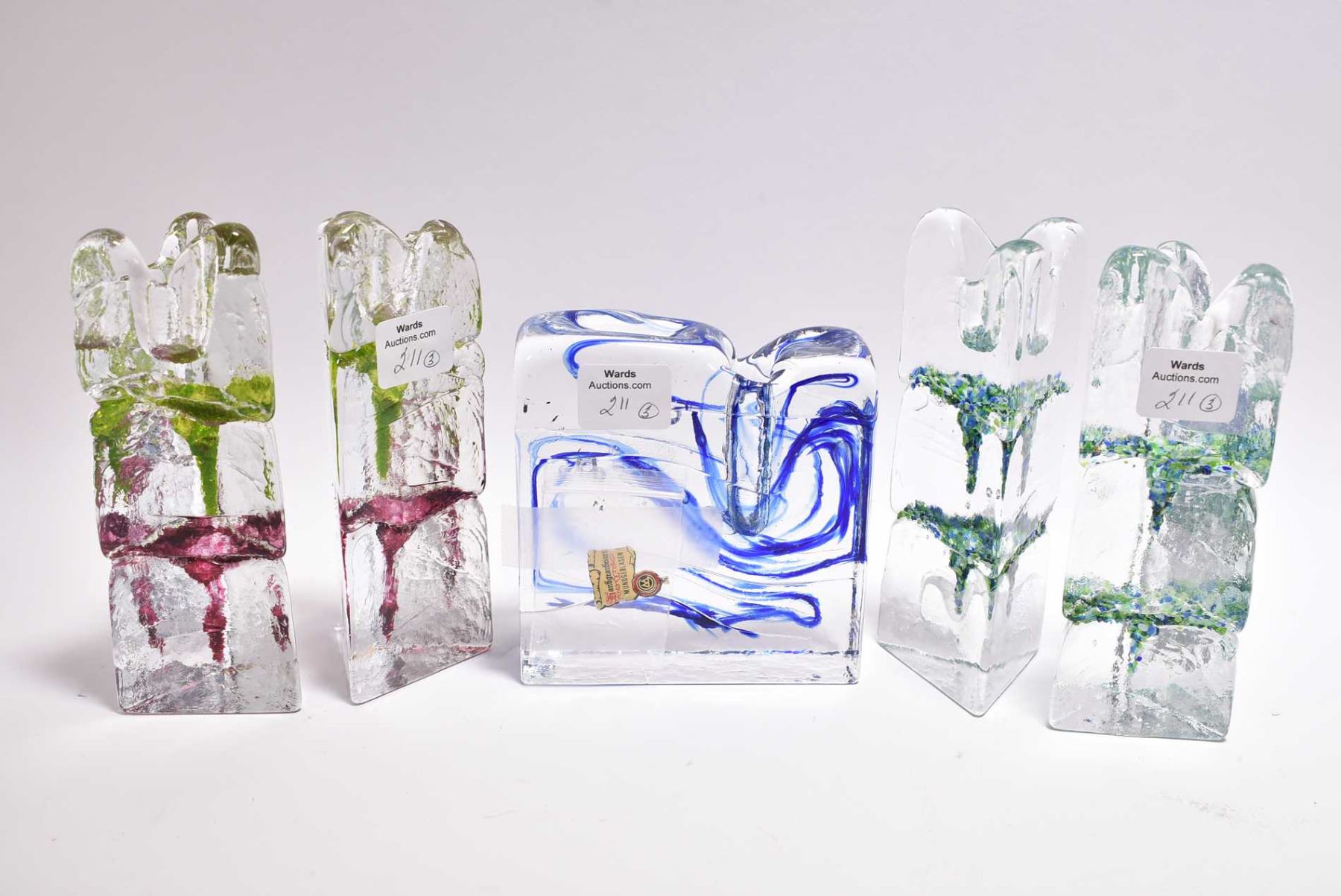 Selection of German art glass candle sticks including two matched pairs and a single 4" high cased glass candlestick with remnants Fandgearbeitet Mundgerblasen label