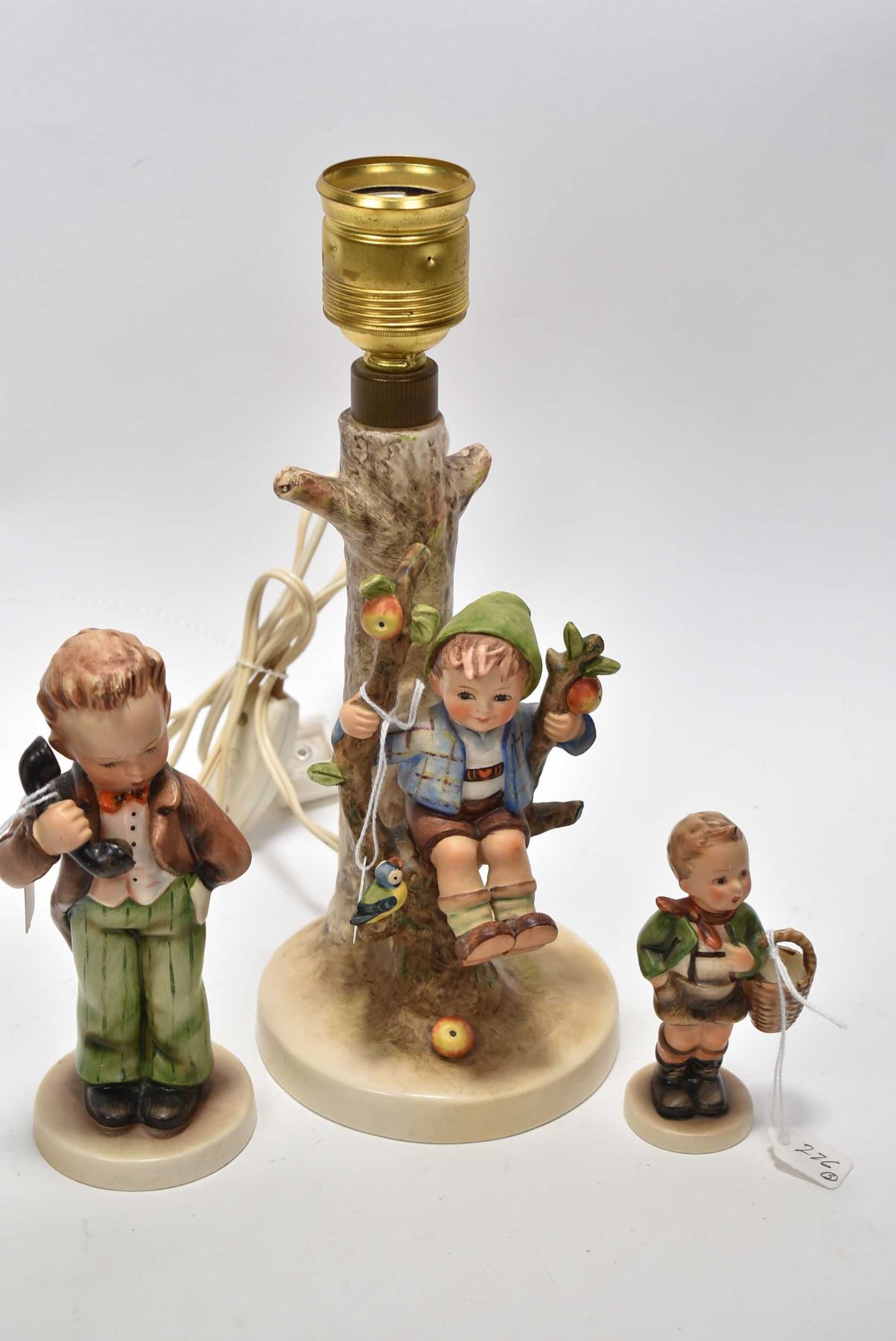 Selection of Goebel Hummel figures including "Apple Tree Boy' lamp and two figures with full bee markings including "Village Boy" and "Hello"