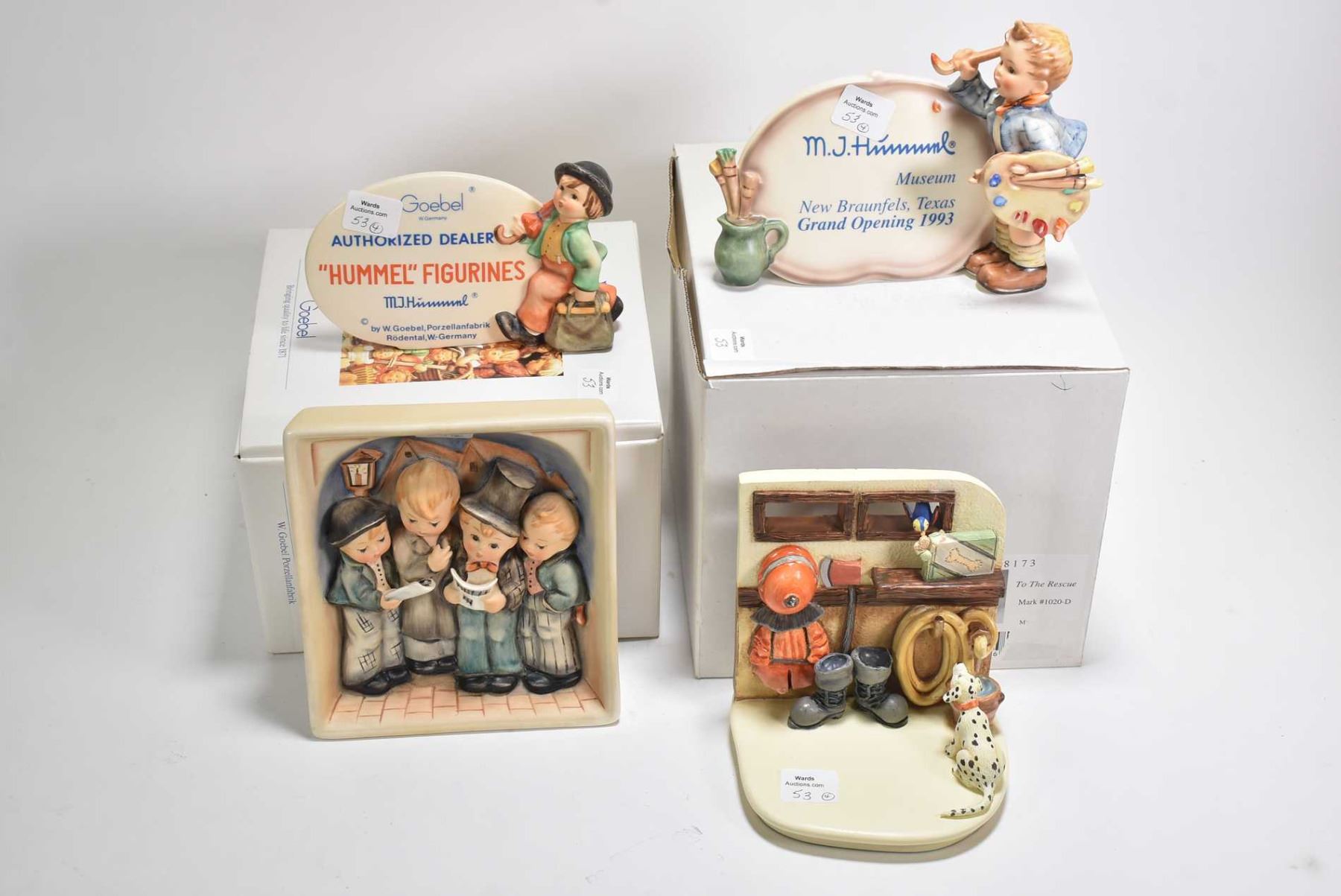 Selection of Goebel Hummel pieces including Museum plaque, Dealer plaque, Singer motif wall plaque plus a Goebel Hummel "To The Rescue" resin bookend