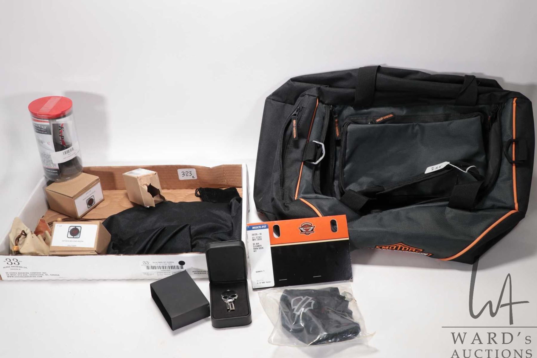 Selection of Harley Davidson collectibles including custom made skeleton key, members coin, travel bag, air filter sock, oil filter wrench, plus two Indian Motorcycle display logos
