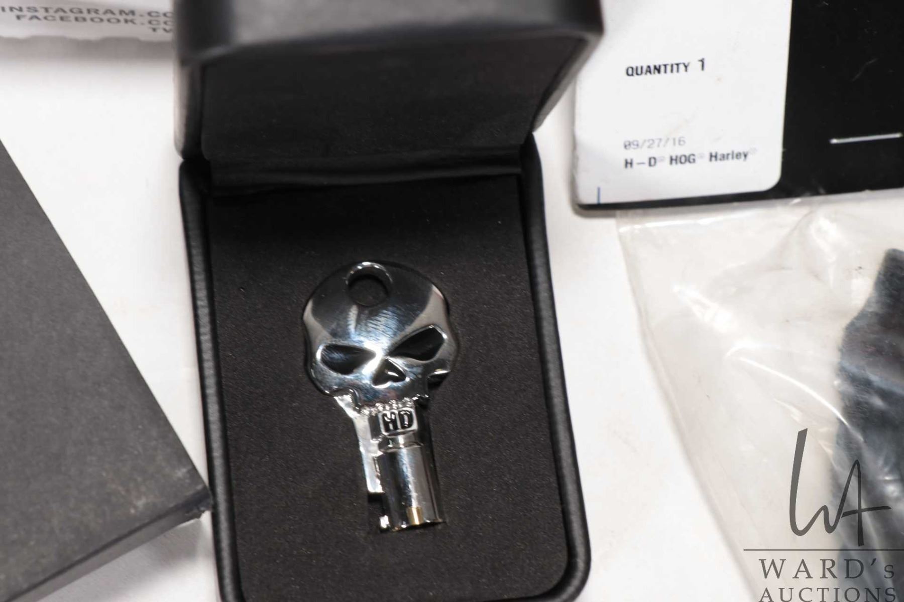 Selection of Harley Davidson collectibles including custom made skeleton key, members coin, travel b