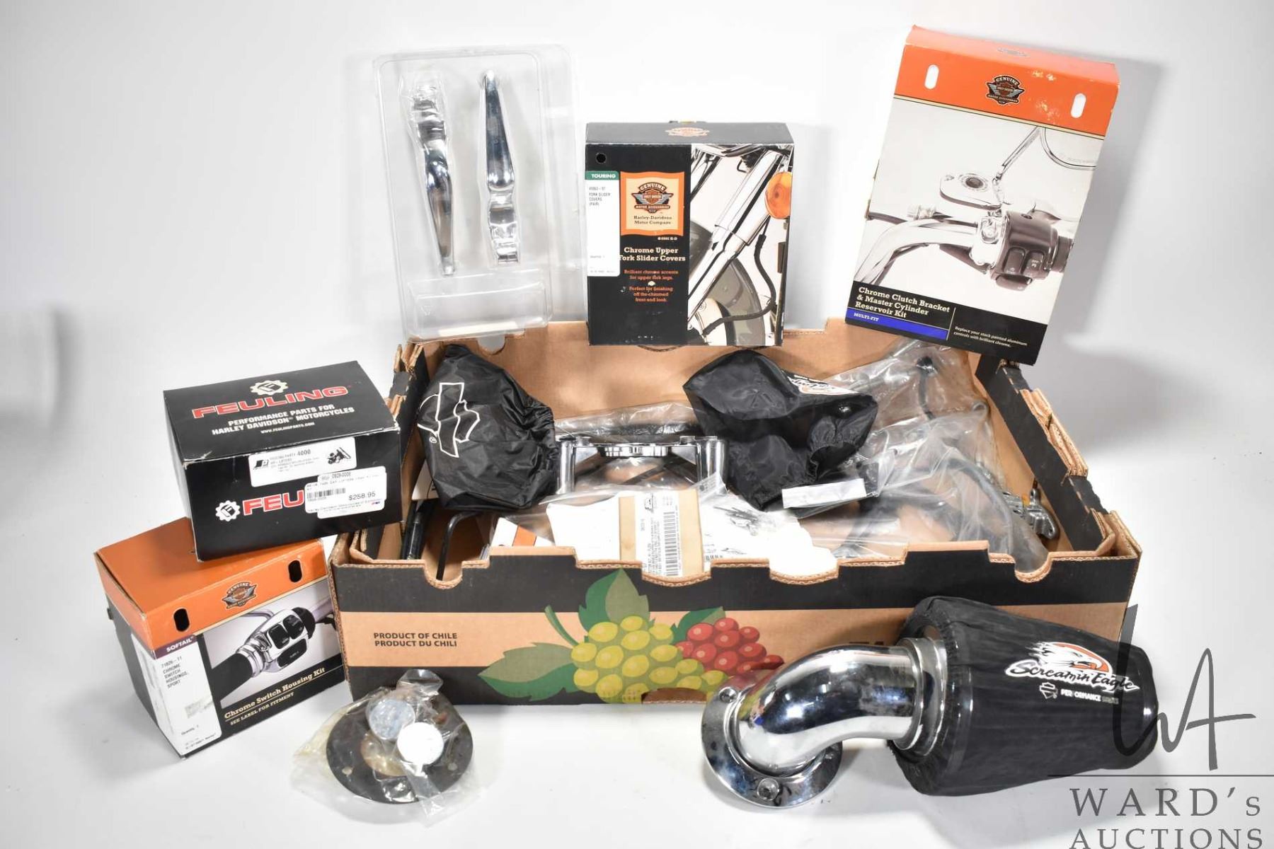 Selection of Harley Davidson parts (Note: All parts are factory original replaced parts) including fork slider covers, chrome clutch bracket and master cylinder, chrome switch housing, clutch & brake levers, lifters & push rods, air intake and assorted cables