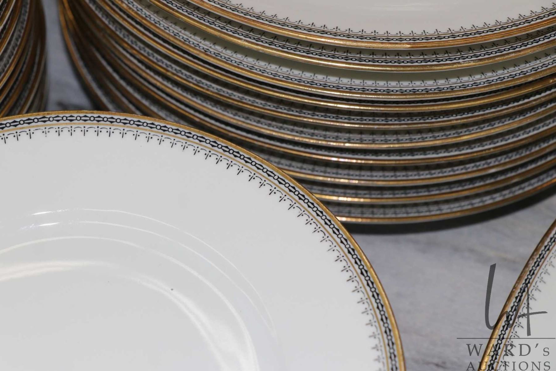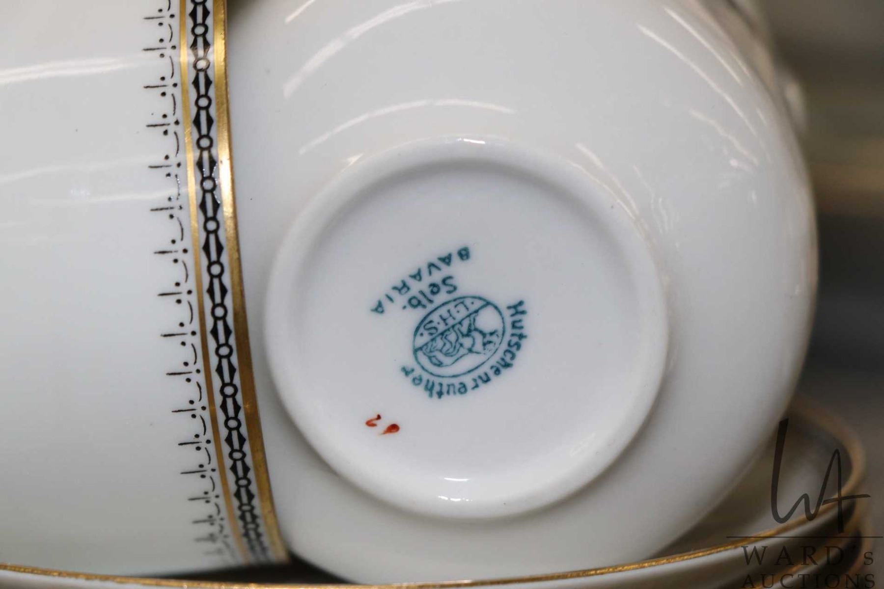Selection of Hutschenreuther Bavarian china dinnerware including twelve 10" plates, ten 8" plates, eleven 6" plates, twelve tea cups, ten saucers, twelve soup bowls, ten fruit nappies, 10" oval open vegetable dish, 15" oval platter, 11 1/2" oval platter, 10" oval celery bowl and a 10" oval lidded vegetable dish