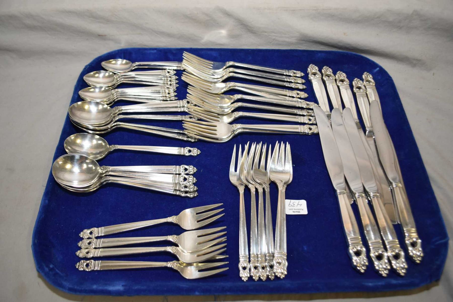 Selection of International "Royal Danish" sterling flatware including nine dinner knives, ten dinner forks, ten dessert forks, ten soup spoons and twelve teaspoons