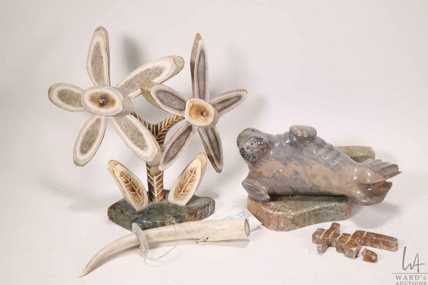 Selection of Inuit carvings and sculpture including soapstone seal on stone base by artist Rob Gruben Tuktoyaktuk N.W.T., note flipper on seal has been repaired, a vertebrae flower sculpture carved on bottom with CM . YK. 10, plus a Art Au Fax hand game etc.
