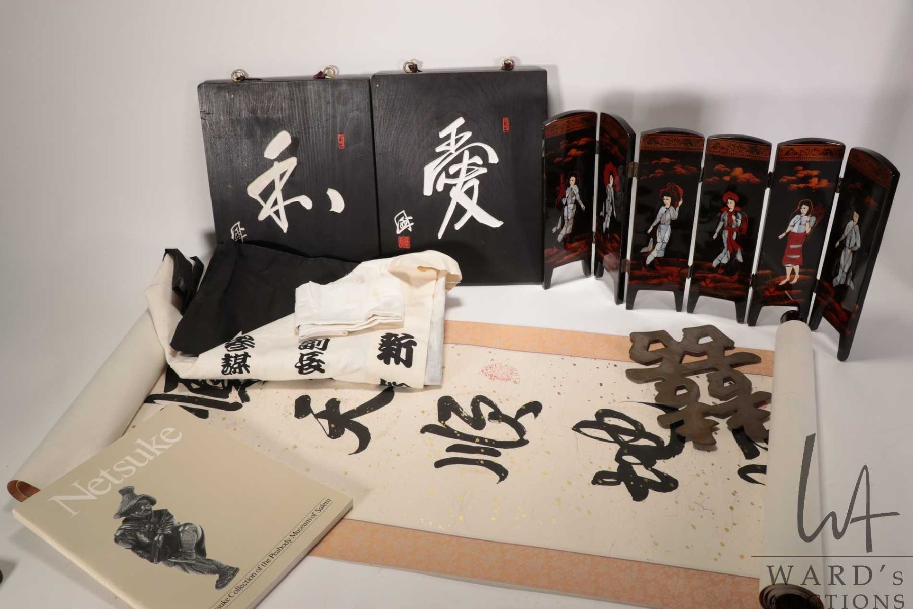 Selection of Japanese collectibles including lacquered mini six panel screen, 10 1/2" in height, Oriental jacket with sash, calligraphy scrolls, two calligraphy wall plaques and a brass Asian character wall hanging and a Netsuke reference book