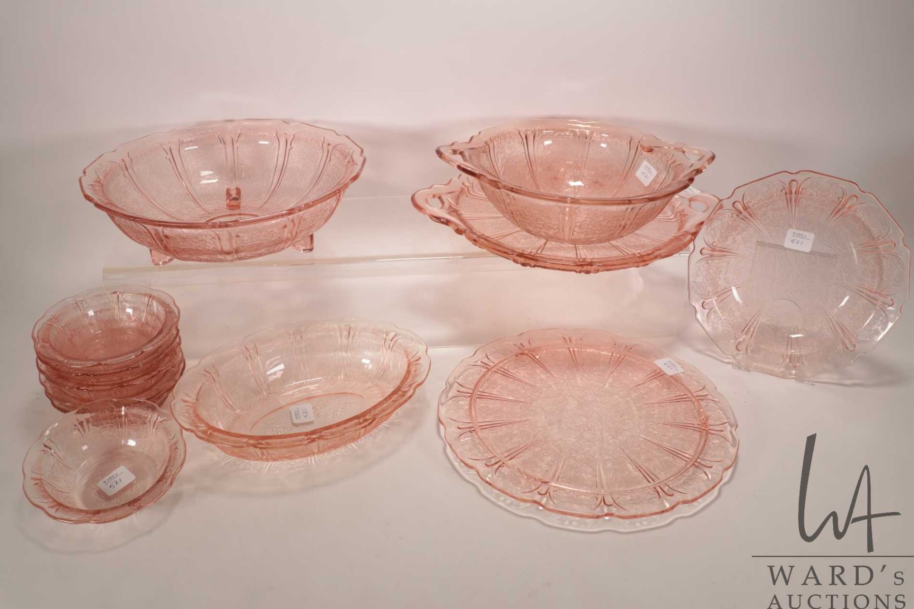 Selection of Jeanette Glass "Cherry Blossom Pink" including fruit bowl with six fruit nappies, doubl