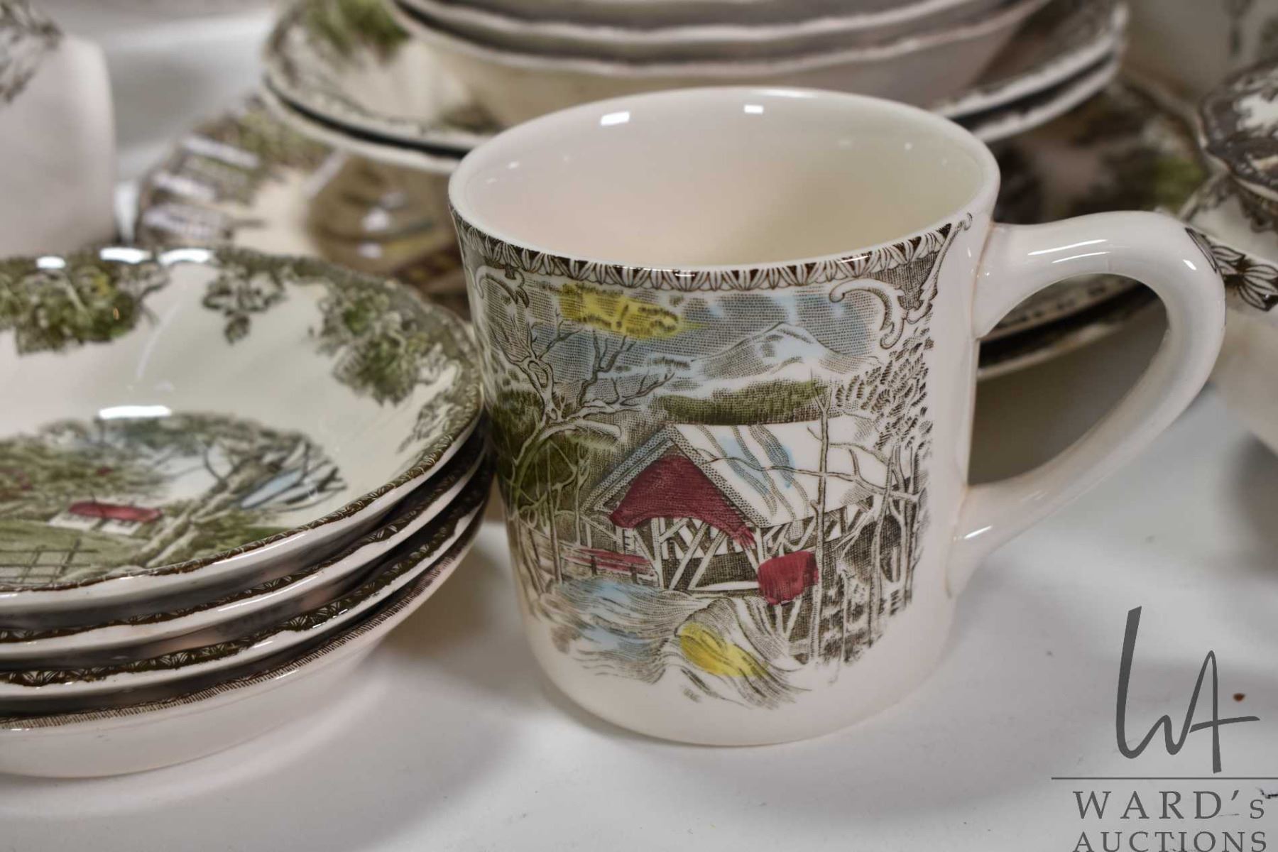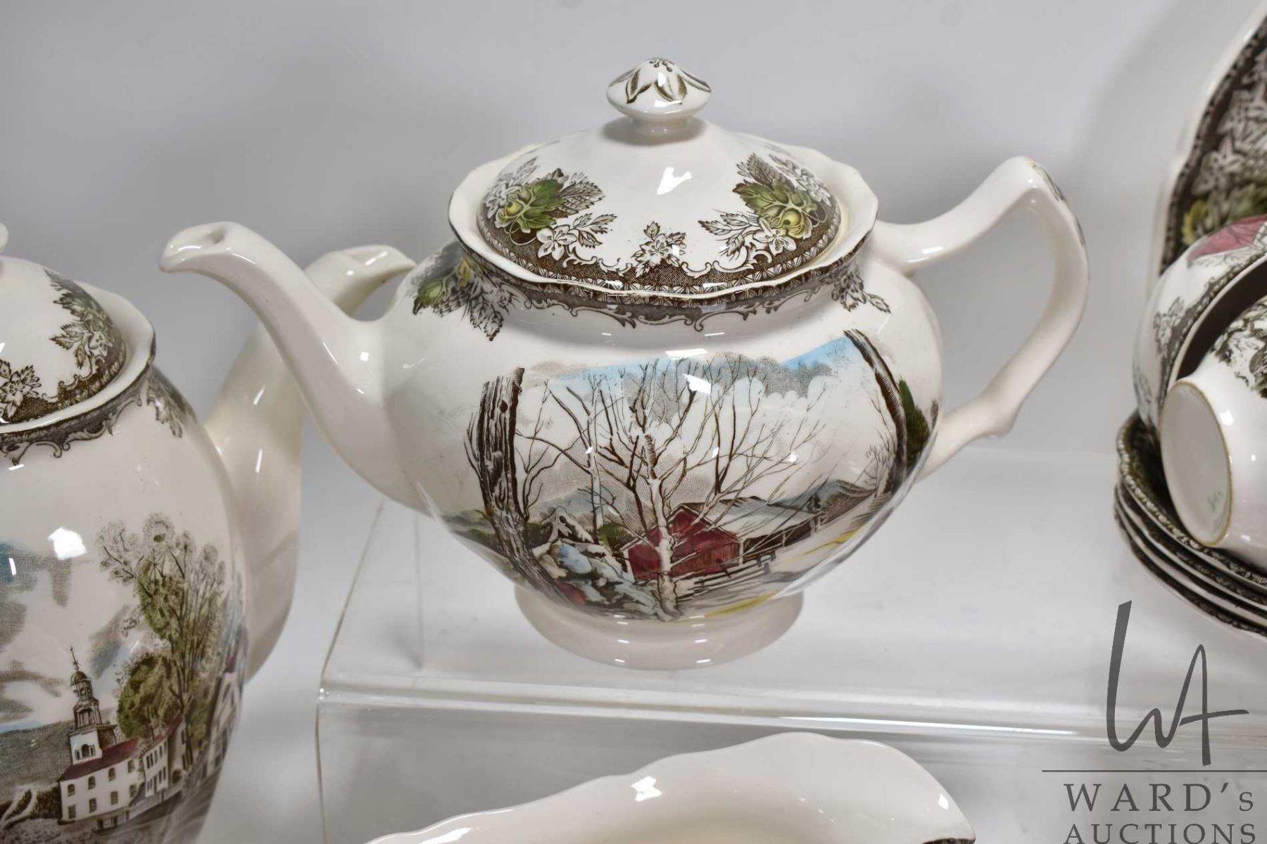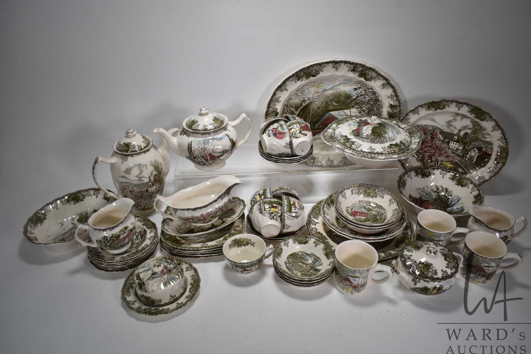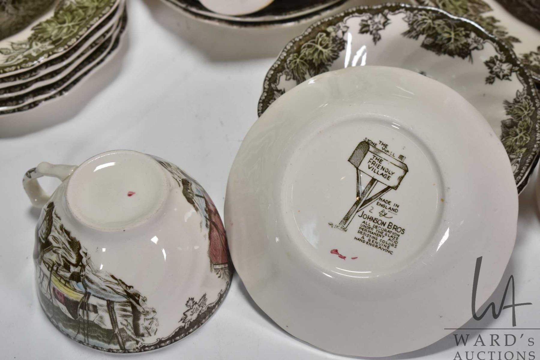 Selection of Johnson Bros. "Friendly Village" dinnerware including table settings, servicing pieces, teapot, coffee pot etc. Note: This item cannot be shipped. Local Pickup Only