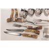 Selection of K. Kimmel Solingen Germany antler handled flat ware including eight each of forks, tablespoons and teaspoons, five knives plus carving set including clever, carving knife, meat fork, sharpener and poultry scissors, each with carved antler handles and etched stainless steel blades