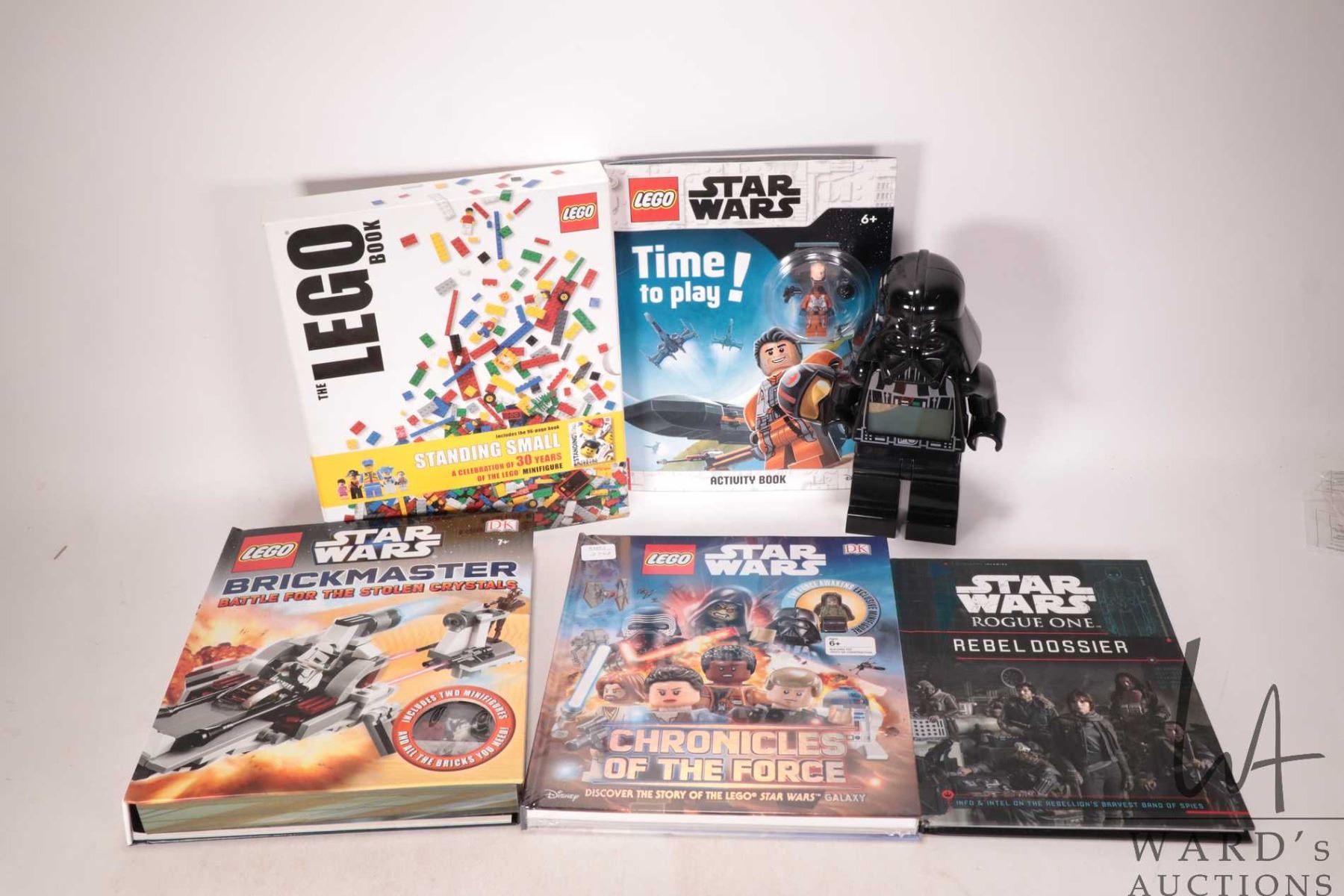 Selection of Lego hardcover books including "The Lego Book" double volume set, "Star Wars" Brickmaster Battle for the Stolen Crystald with Minifigures, "Star Wars" Chronicles of the Force with Minifigure, "Star Wars" Rogue One Rebel Dossier and a Lego "Star Wars" softcover game book with Minifigure and a Darth Vadar Alarm Clock