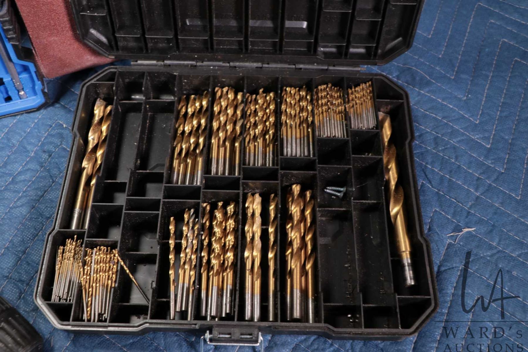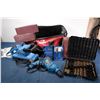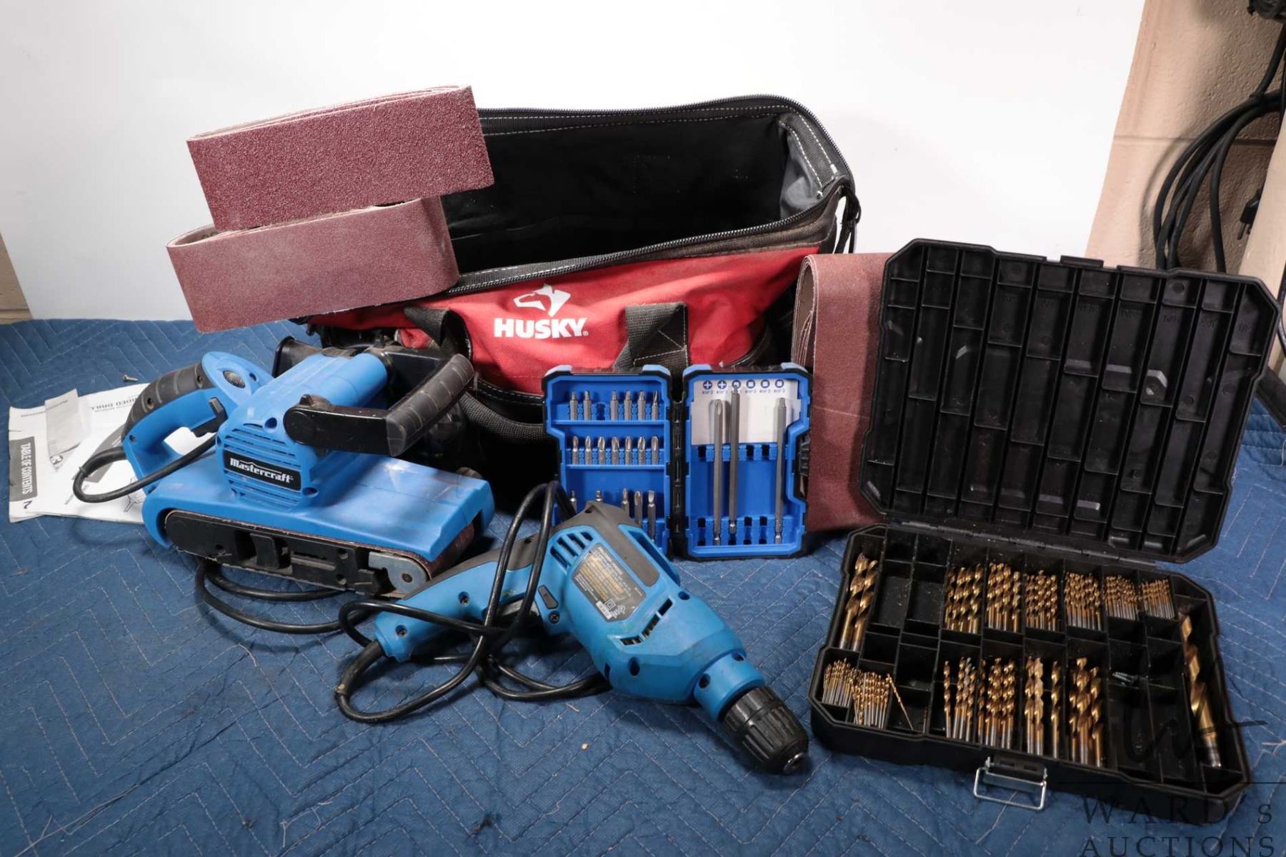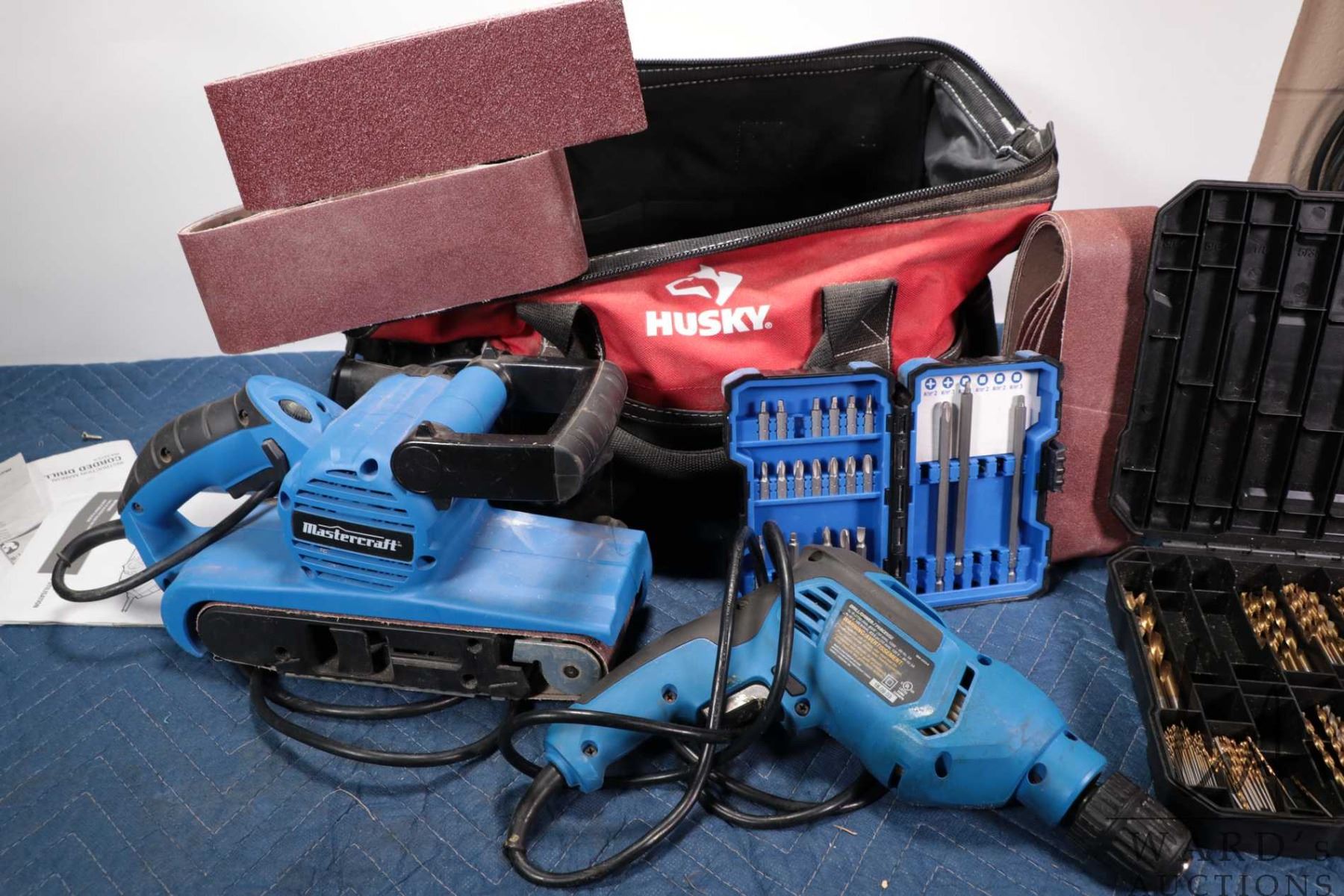 Selection of Mastercraft power tools including 3 X 21" Belt Sander with extra belts, 3/8" corded drill, partial set of screw driver bits and drill bits, all in Husky bag, electrical tools working at time of cataloguing