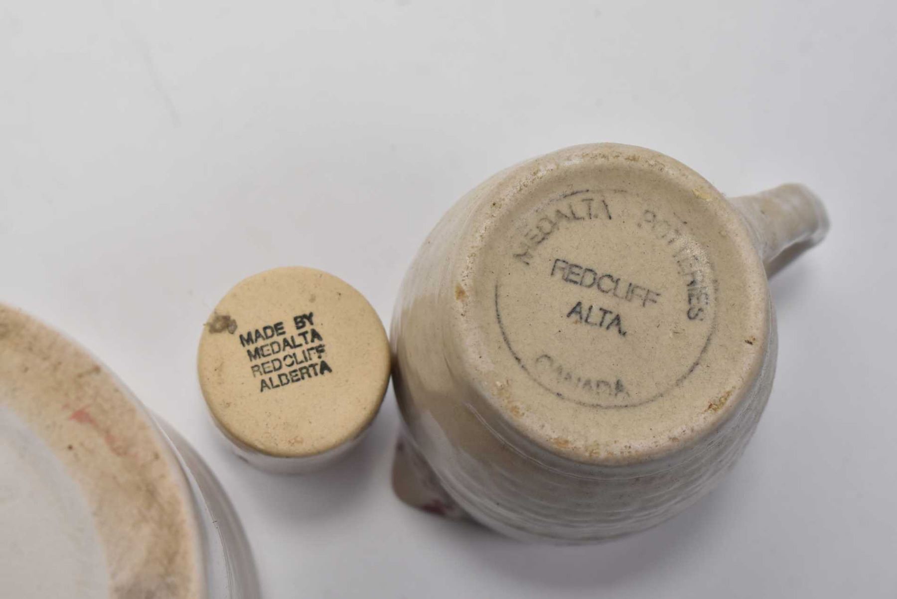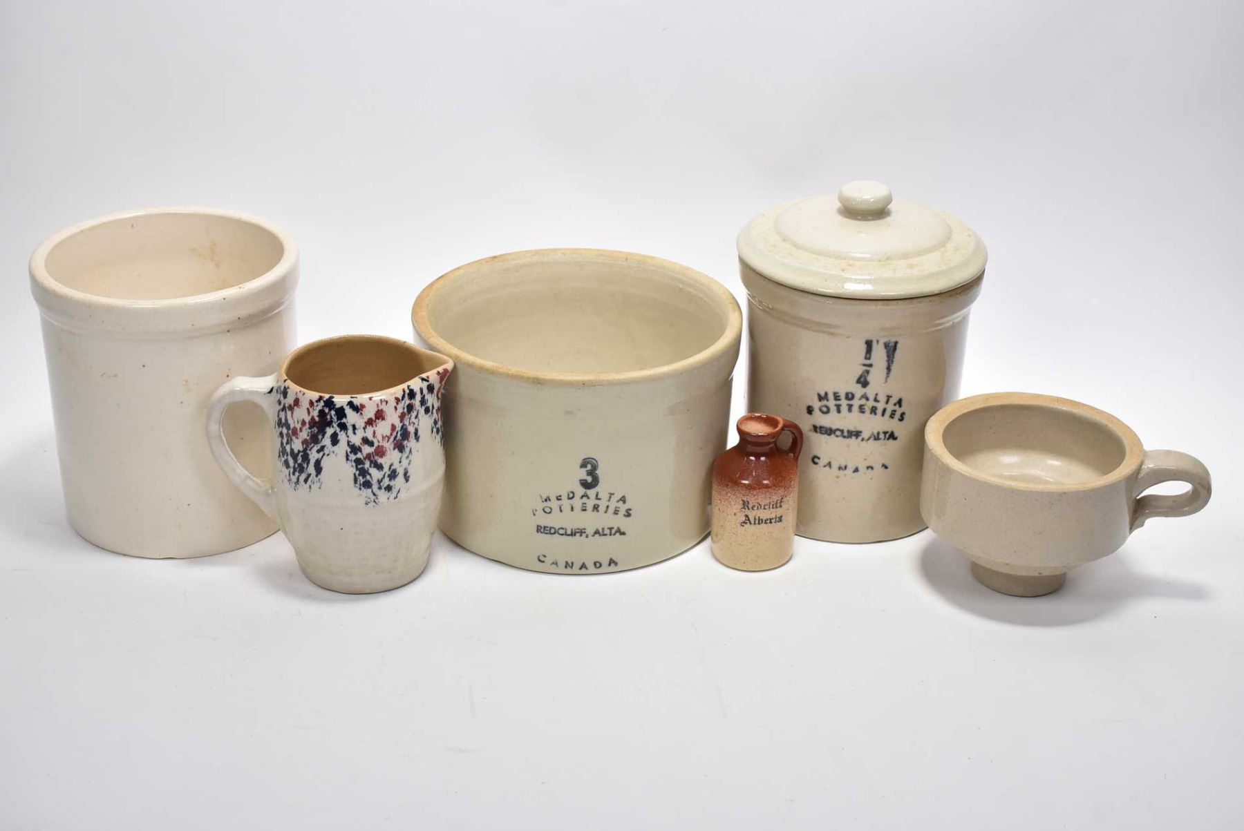 Selection of Medalta Pottery including splatter glazed pitcher, lidded 1 quart crock, two small crocks sans lids plus a stoneware funnel and a miniature jug