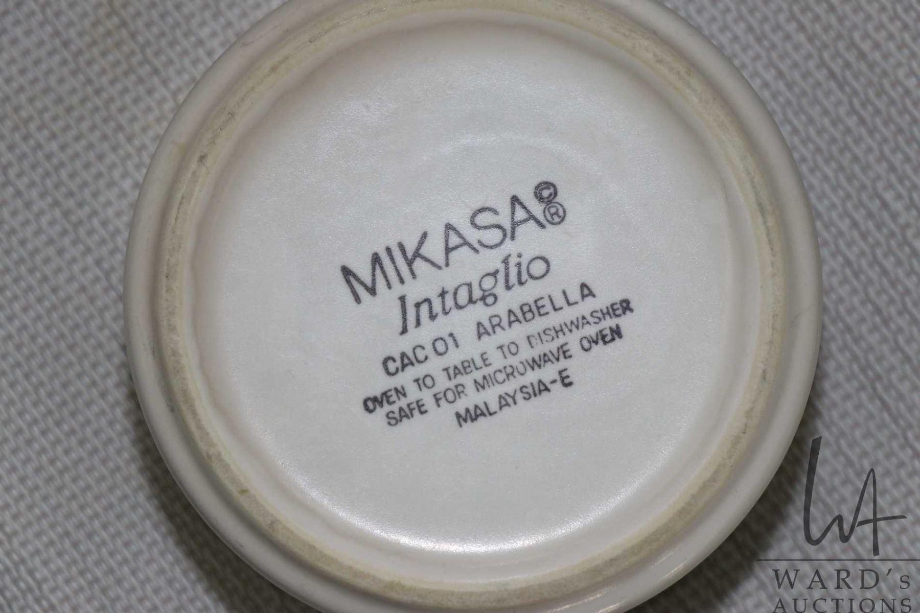 Selection of Mikasa "Intaglio" dinner ware including ten 10" dinner plates, twelve 8 1/2" side plate, twelve 6 1/2" bread and butter plates, twelve soup bowls, five cereal bowls, five ramekins, ten cups, six shakers, 14" round platter, 15" oval platter, covered butter dish and napkin holder