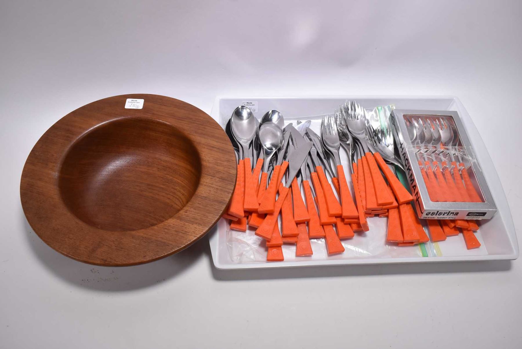 Selection of Nanny Still mid century table items including 11" diameter teak center bowl and a selection of Colorina for Hackman Finnish made flatware including 18 forks, 17 knives, 6 tablespoons, 5 teaspoon and a boxed set of six luncheon forks