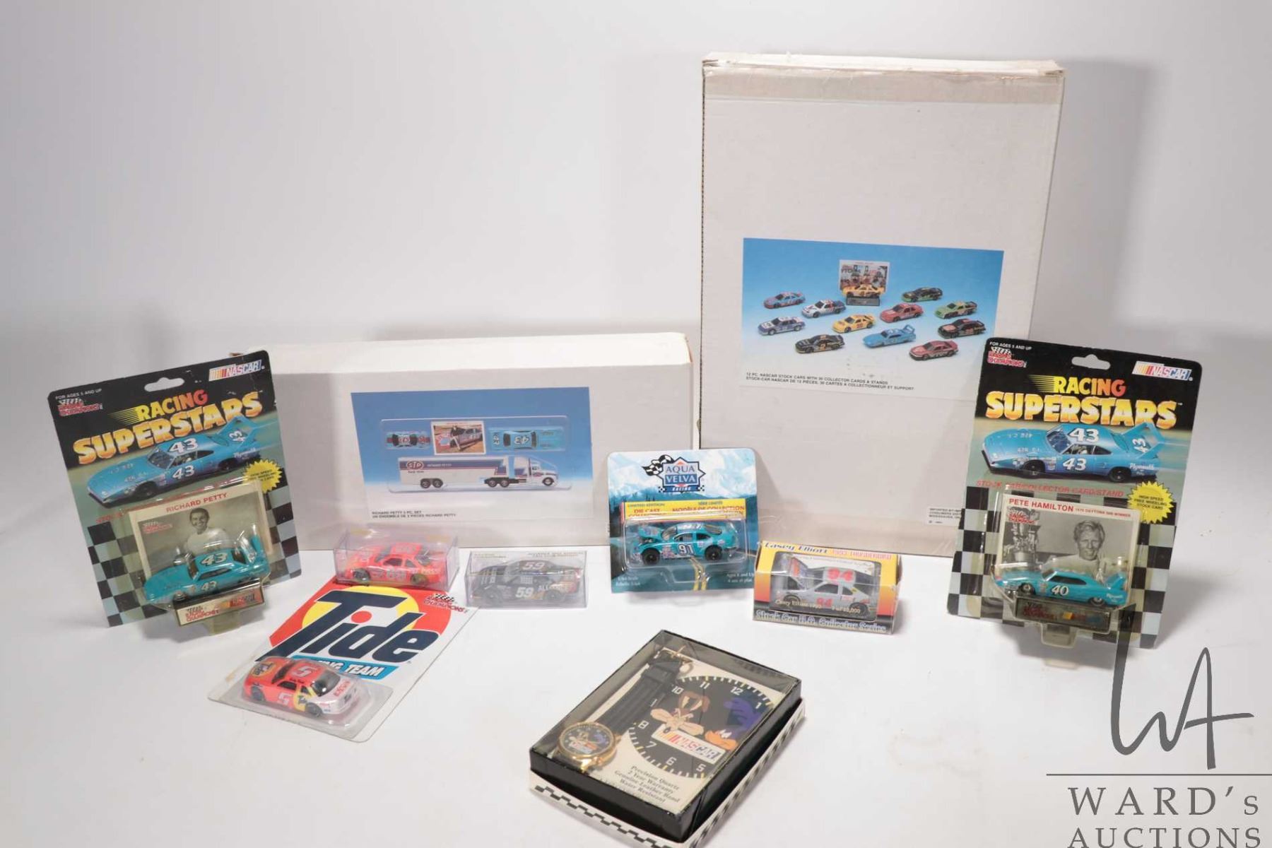 Selection of Nascar die cast collectibles including 12 piece stock car set in original packaging, Richard Petty 3 piece truck and car set, Richard Petty & Pete Hamilton car & card sets, 5 individual Nascar toys and a Nascar Looney Tunes collectible watch