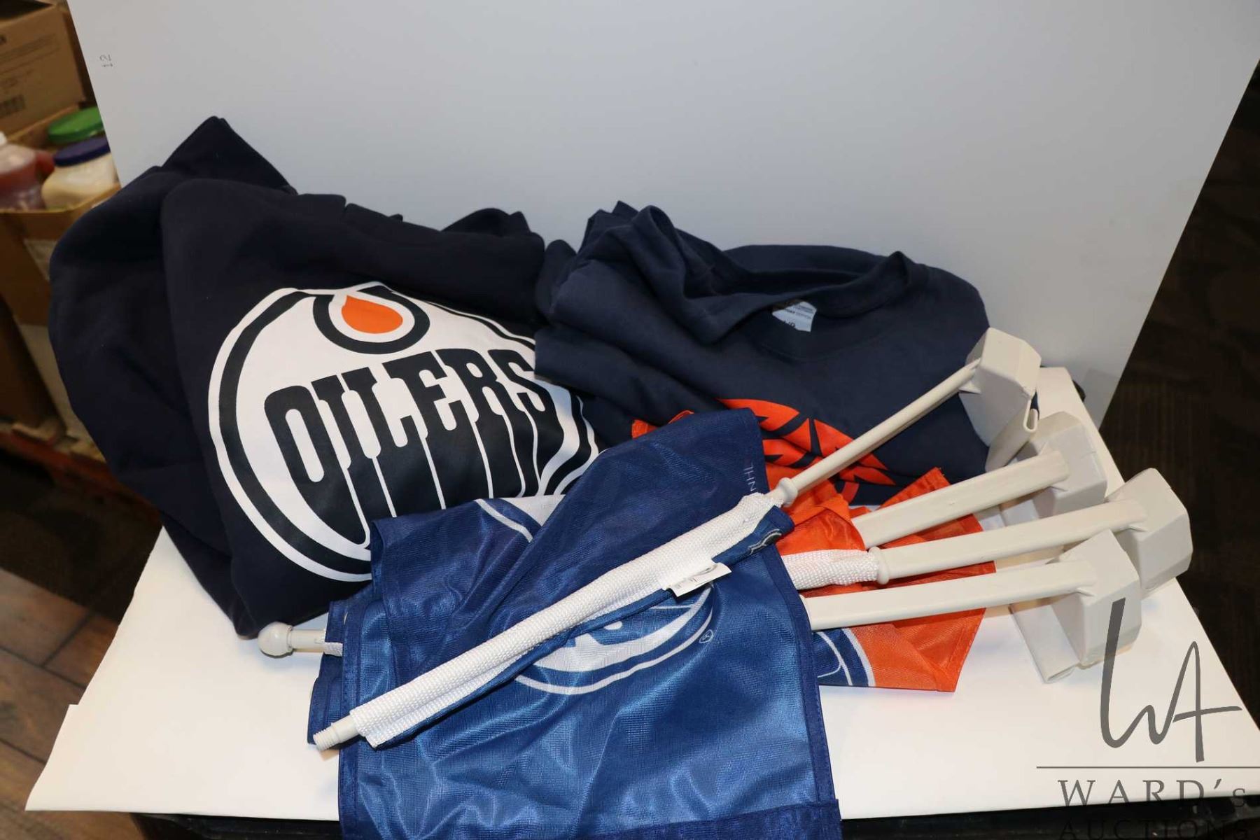 Selection of Oilers clothing including four T-Shirts and one hoodie. Plus four car flags