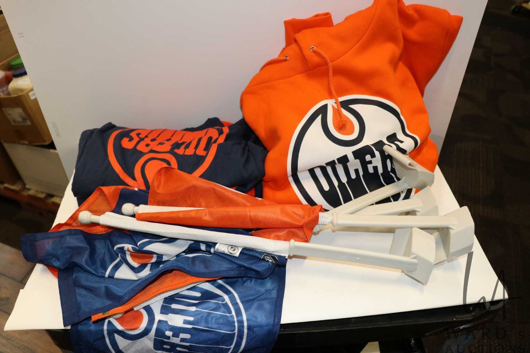 Selection of Oilers clothing including four T-Shirts and one hoodie. Plus four car flags