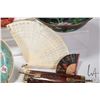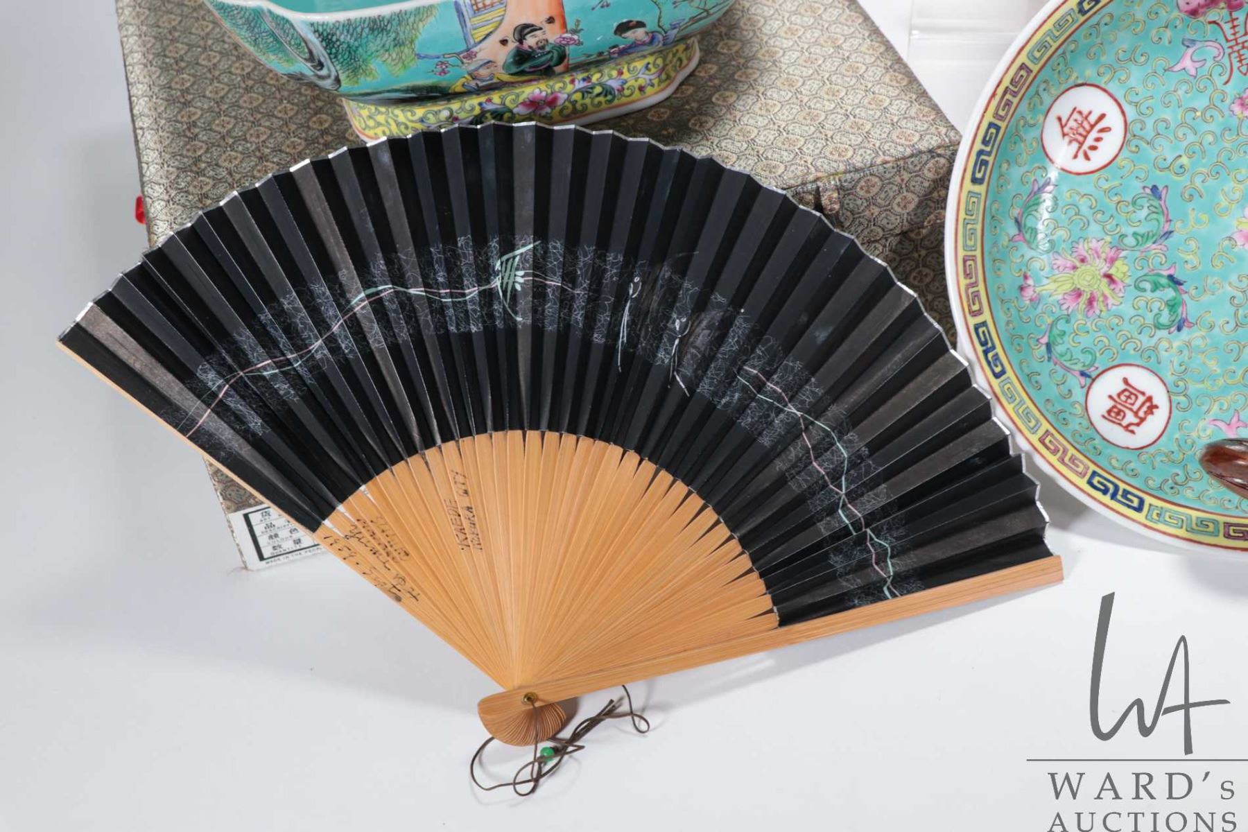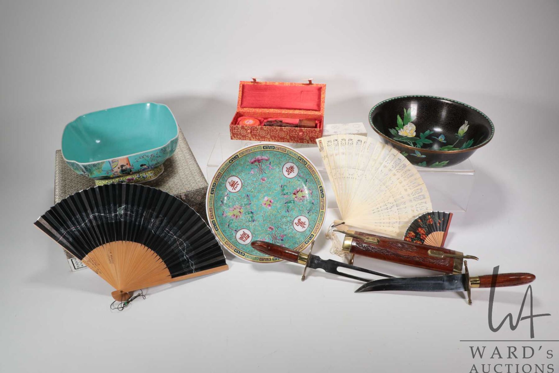 Selection of Oriental collectibles including 10" diameter cloisonne style bowl, 9" square bowl in presentation box, carved seal with ink, fans etc.