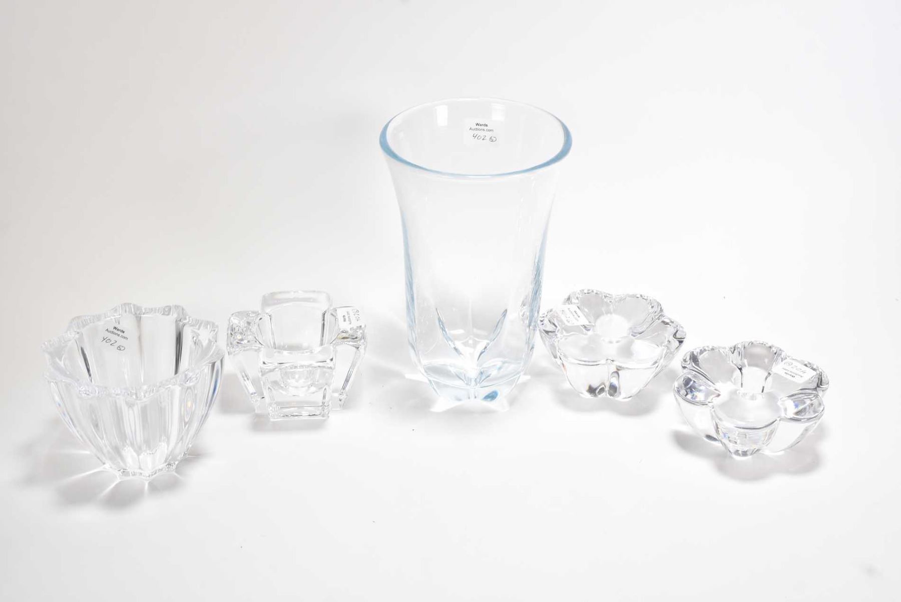 Selection of Orrefors crystal including a matched pair of candle holders, two small dishes and an 8" blue tinged coloured vase