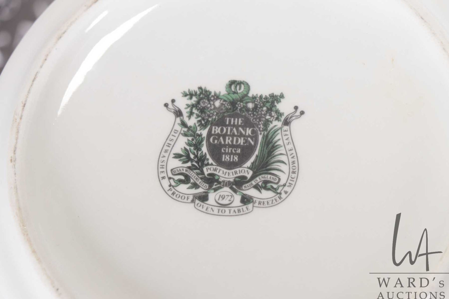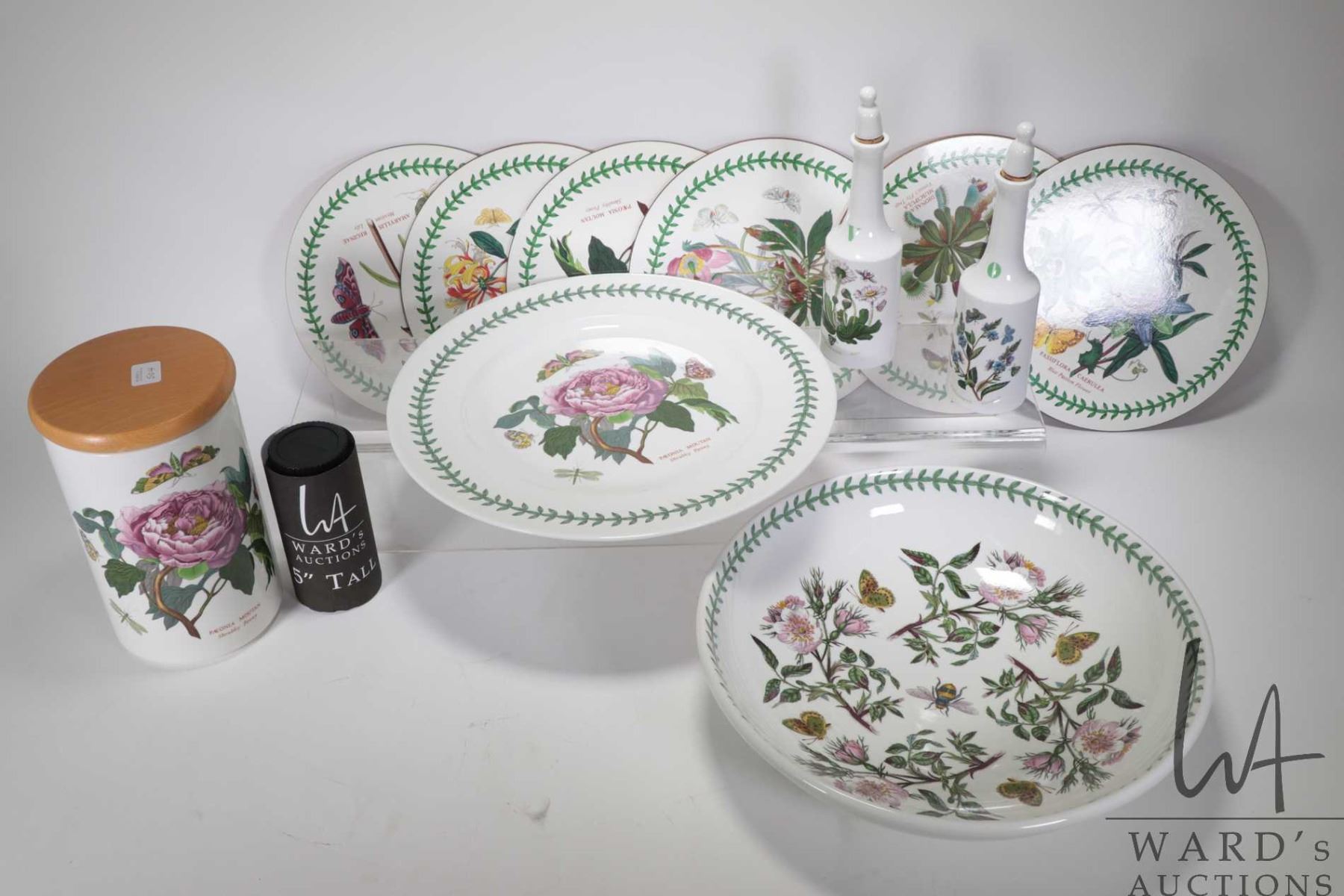 Selection of Portmeirion Botanic Garden including 13" charger, a 13" diameter pasta bowl, oil and vinegar bottles, a pasta canister and six cork table pads. Note: Not available for shipping. Local pickup only