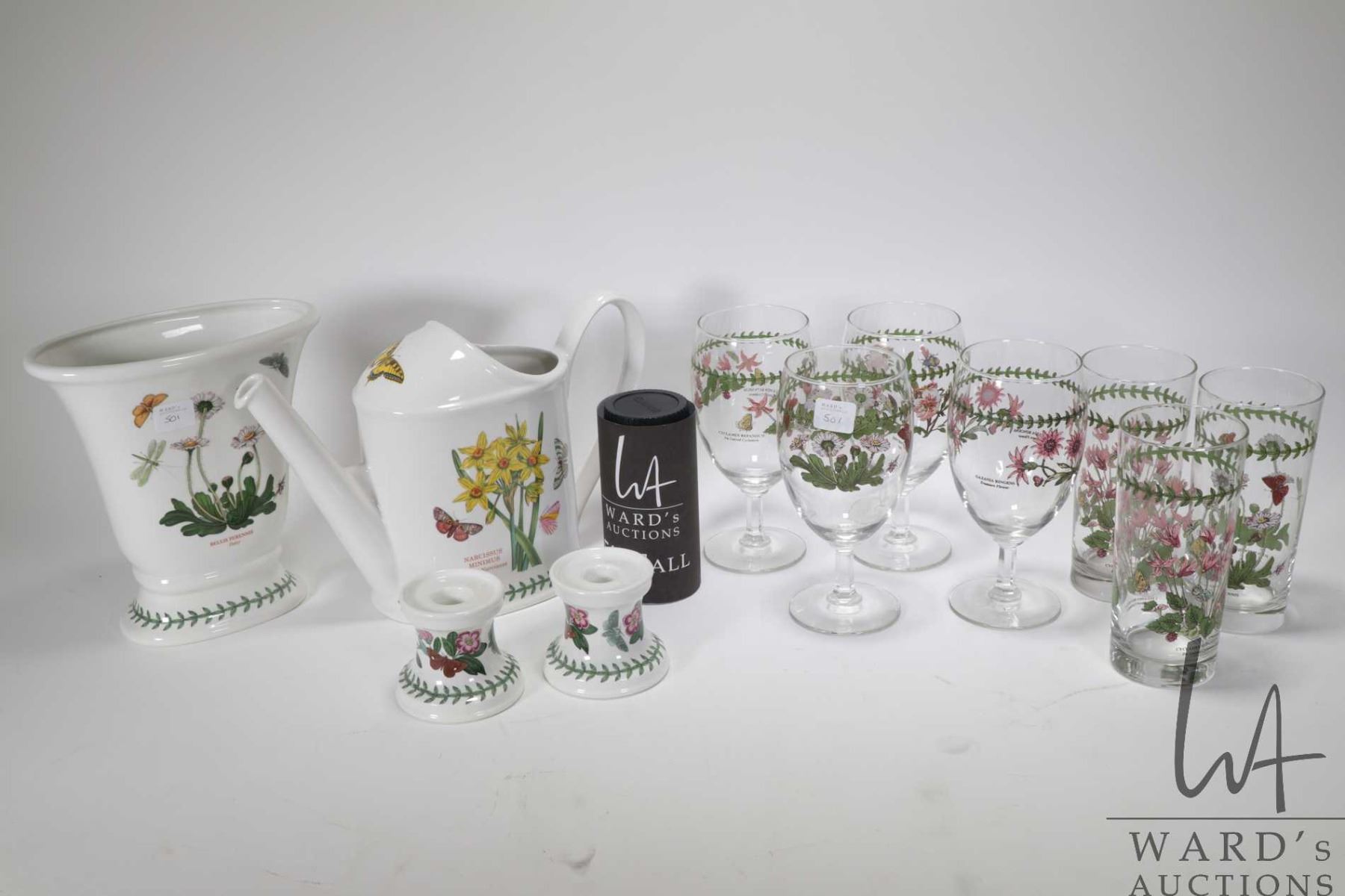 Selection of Portmeirion Botanic Garden including four wine glass, three tumblers, two candle holders and a vase and watering jug. Note: Not available for shipping. Local pickup only