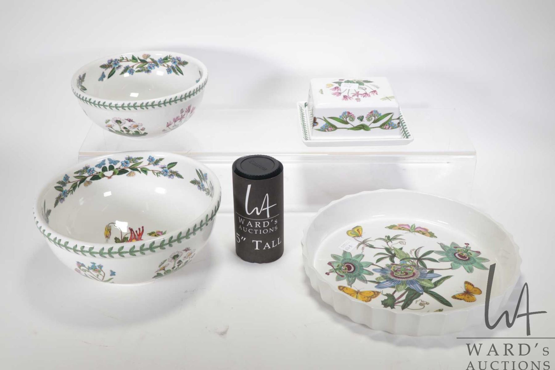 Selection of Portmeirion Botanic Garden including lidded butter dish, two graduated bowls and an 11" diameter quiche dish. Note: Not available for shipping. Local pickup only