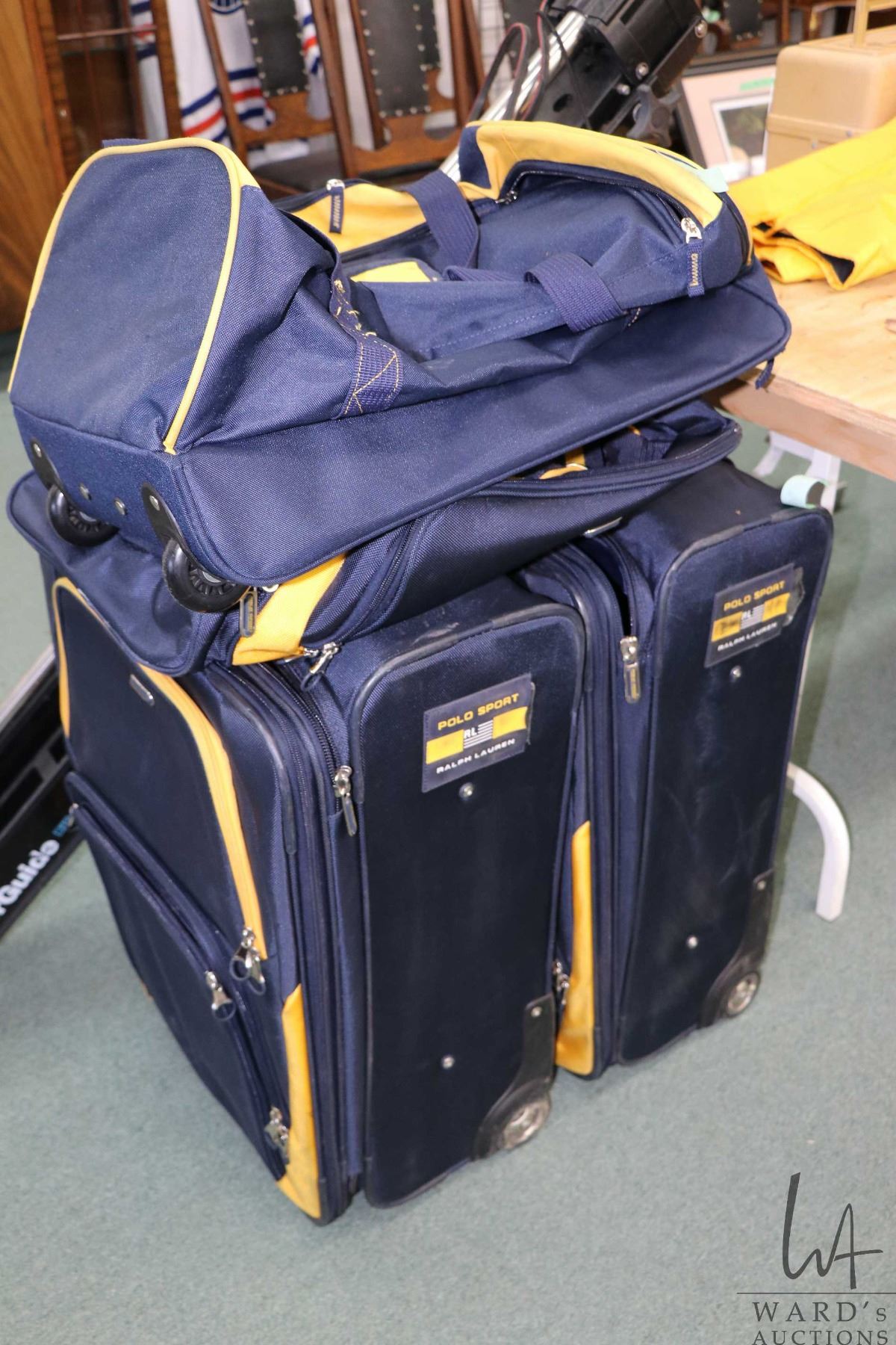 Selection of Ralph Lauren Polo Sport luggage including suitcases and carry-on, all with rollers, plus matching duffel bag and a Nautica duffel bag with rollers