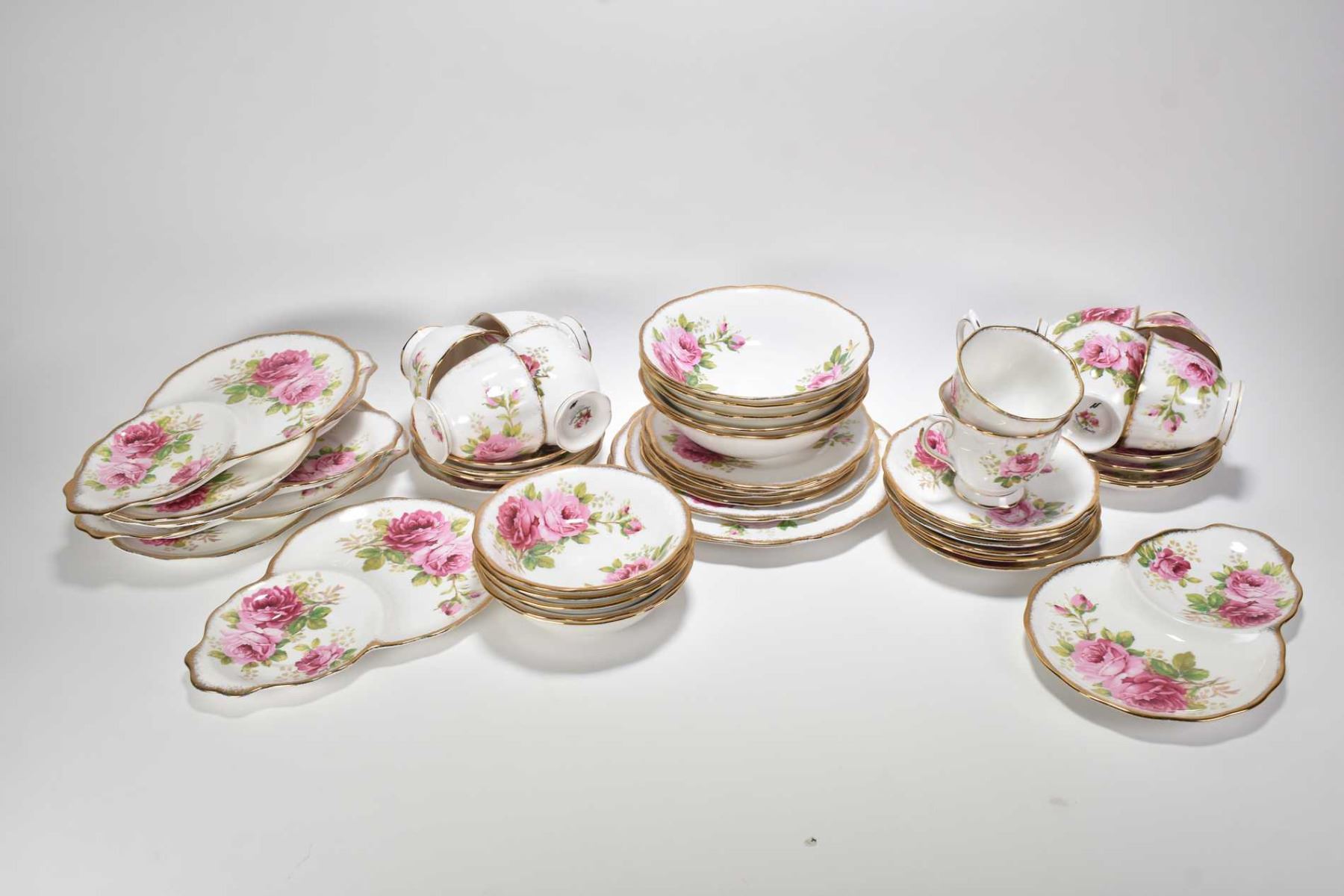 Selection of Royal Albert "American Beauty" bone china including eight tennis saucers, ten teacups, fourteen saucers, five fruit nappies, five cereal bowls, four bread and butter plates, one side plates and one luncheon plate. Not available for shipping. Local bidders only