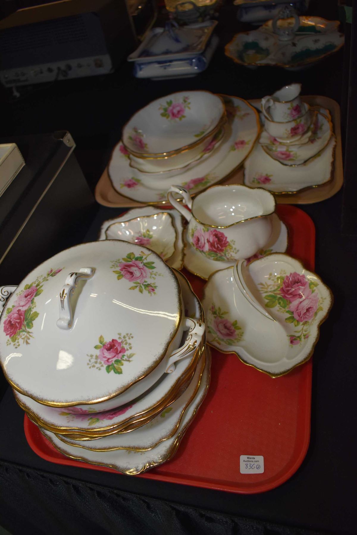 Selection of Royal Albert "American Beauty" bone china serving pieces including three dessert trays, three round open vegetable dishes, one covered vegetable dish, two oval serving bowls, selection of assorted sized and shaped serving tray/dishes, large oval meat platter, sauce boat with drip tray and a cream jug and open sugar bowl. Not available for shipping. Local bidders only