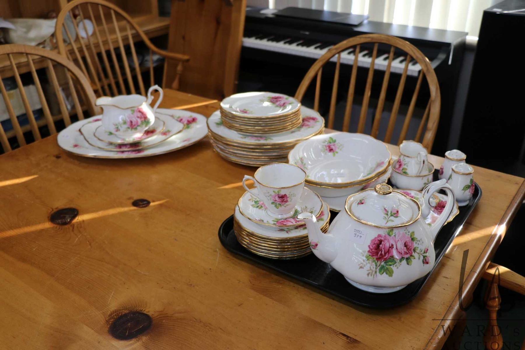 Selection of Royal Albert "American Beauty" china including eight each of 10" dinner plates, 7" plates and 6" plates, teapot, cream and sugar with tray, set of shakers, two 9" oval serving dishes, one teacup and saucer, sauce boat and tray, 9" cake plates and a 15" oval platter, 12" snack tray etc.
