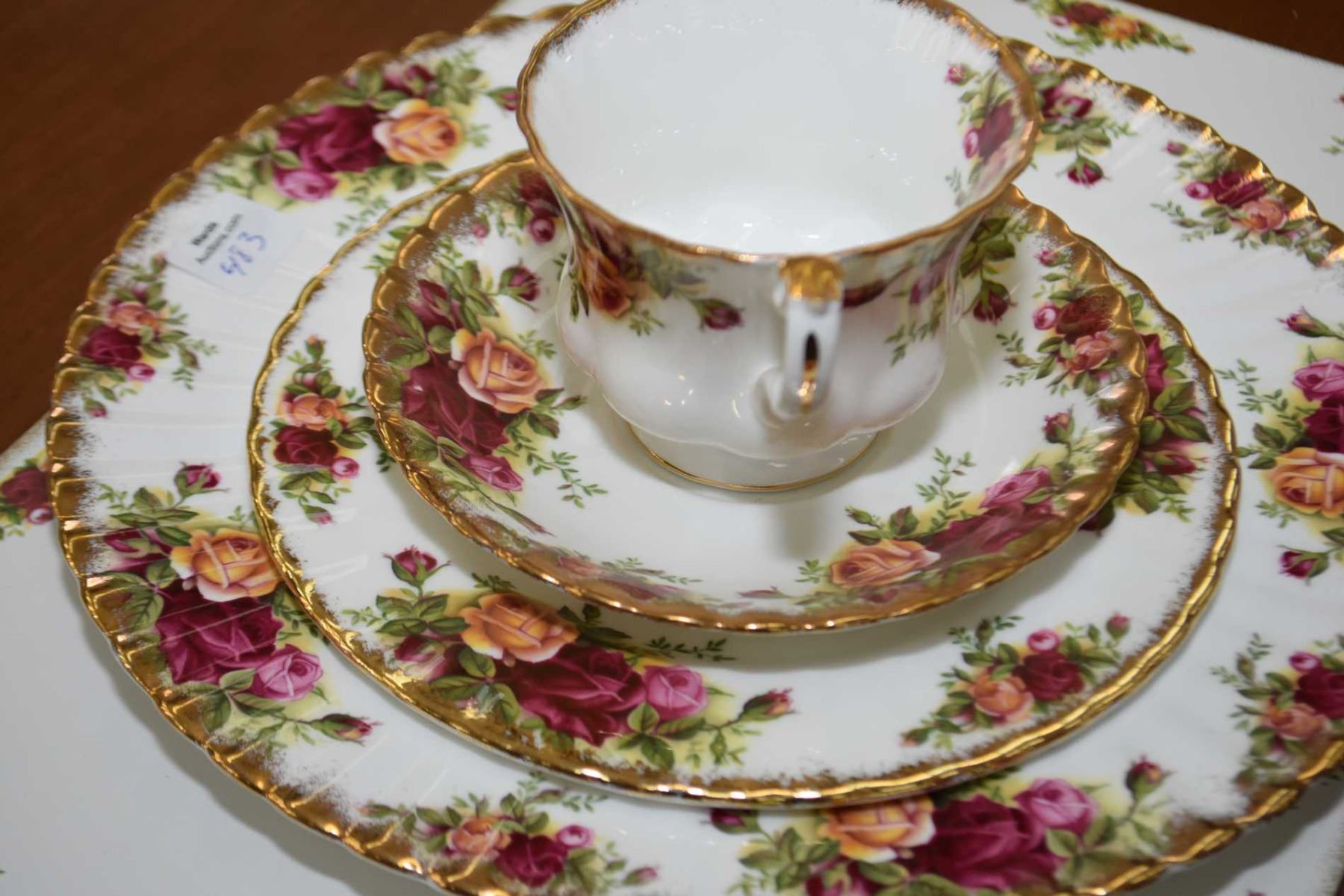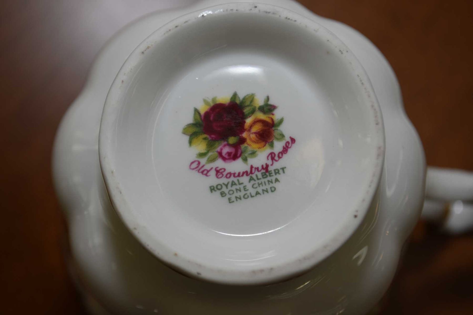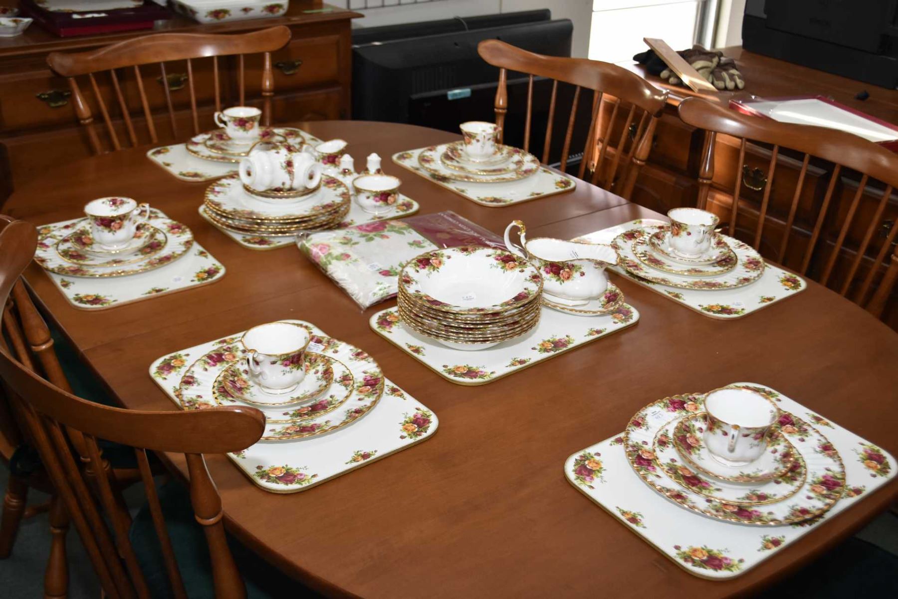 This item is not available for shipping. Local pickup only. Selection of Royal Albert "Old Country Roses" bone china dinnerware including eleven dinner plates, six side plates, nine tea cups and saucers, eight soup bowls, open cream and sugar, shakers, gravy boat and drip tray plus a Old Country Roses tablecloth and eight placements