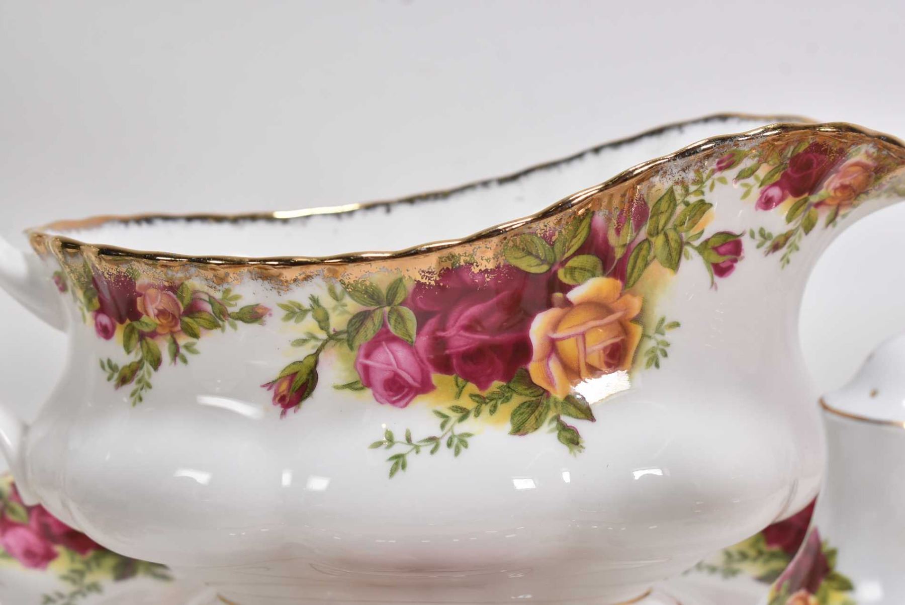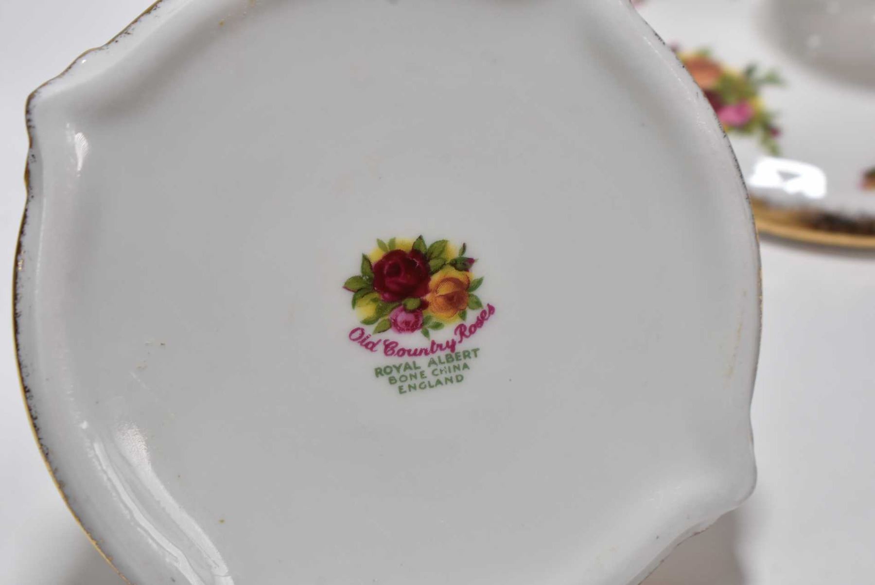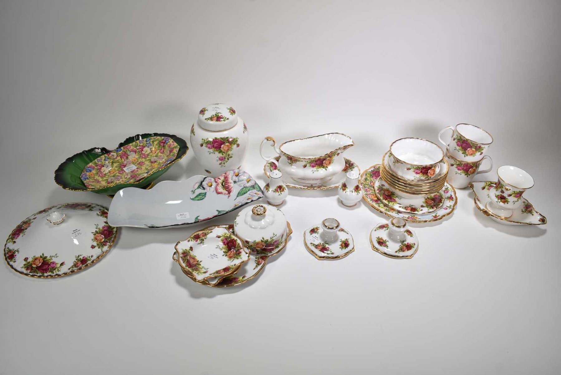 Selection of Royal Albert Old Country Roses china dinner ware including six cereal bowls, two mugs, gravy boat and drip tray, pair of candlesticks, trivet, shakers, lidded ginger jar etc. plus a Royal Winton chintz dish and two pieces of Carltonware including Vert Royal footed dish