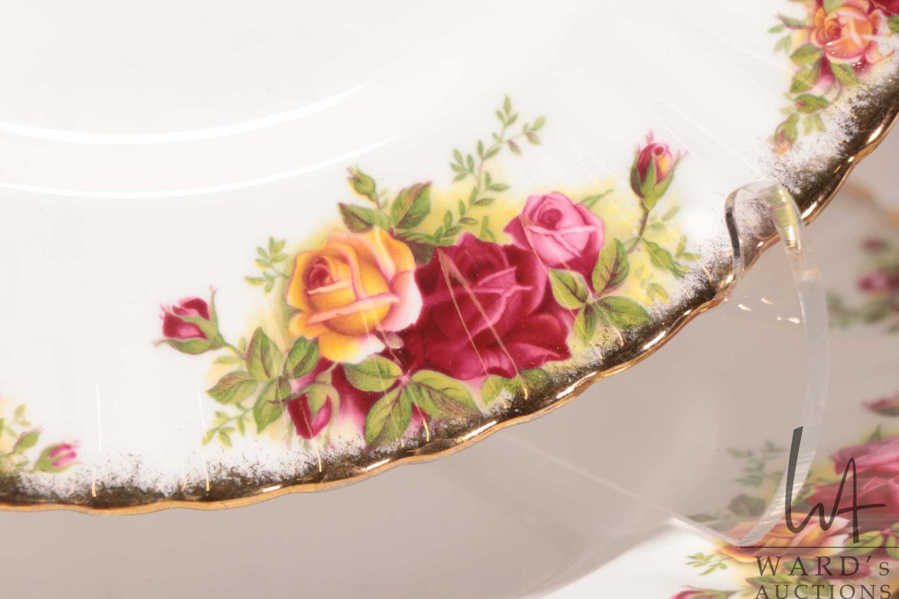 Selection of Royal Albert Old Country Roses china including eight 10" dinner plates, eight teacups and saucers, six cereal bowls, six fruit nappies, six 8" plates, one 7" plate, two 6 1/2" plates, gravy boat and drip tray, two round serving bowls, cream and sugar, two sets of shaker and a small tray, 13" oval platter and two small demitasse saucers plus a sweet meat dish