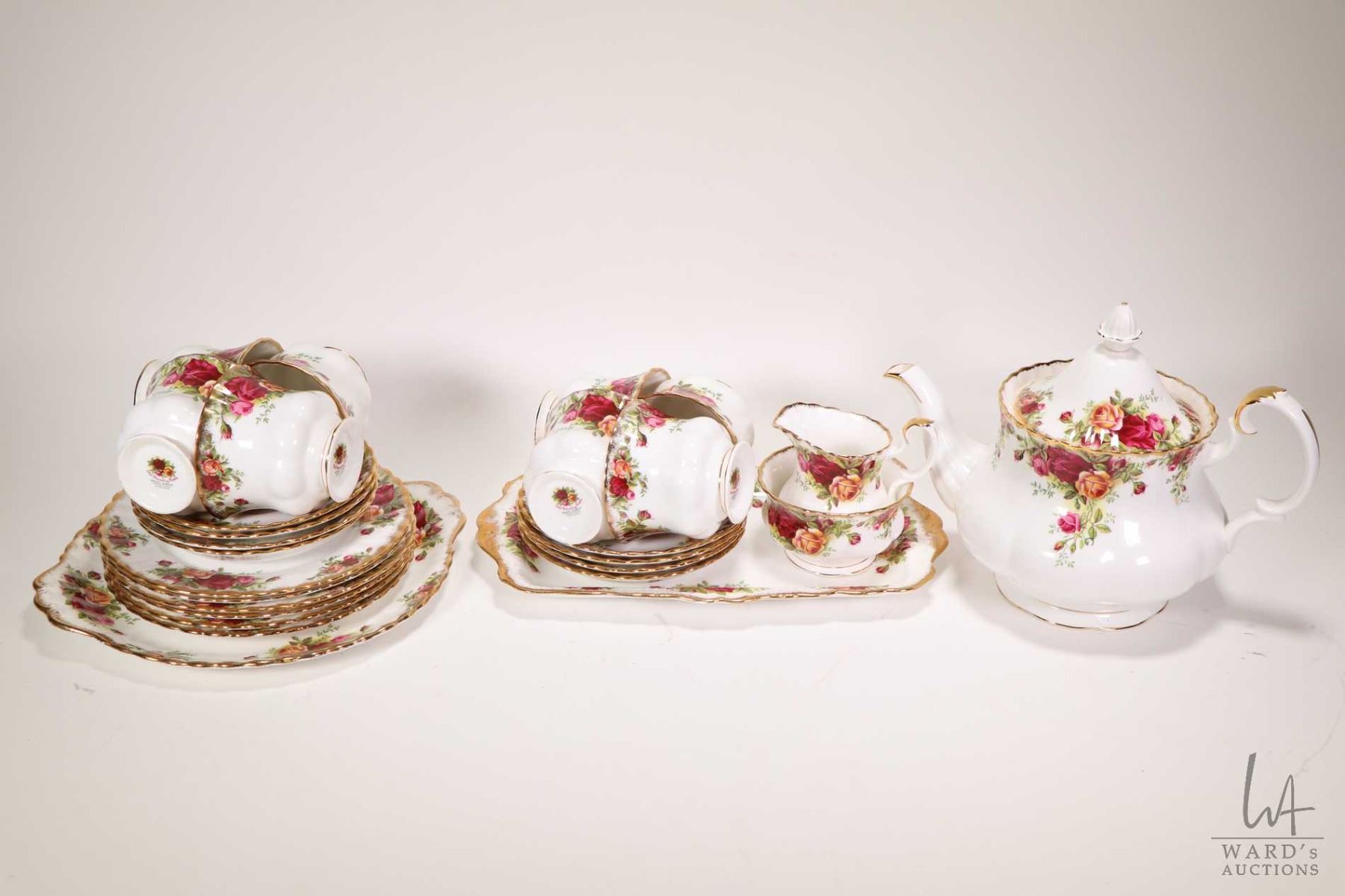 Selection of Royal Albert "Old Country Roses" china including eight teacups and saucers, six sandwich plates, teapot, cream and open sugar with drip tray and a cake plate. Note: No Shipping. Local Pickup Only