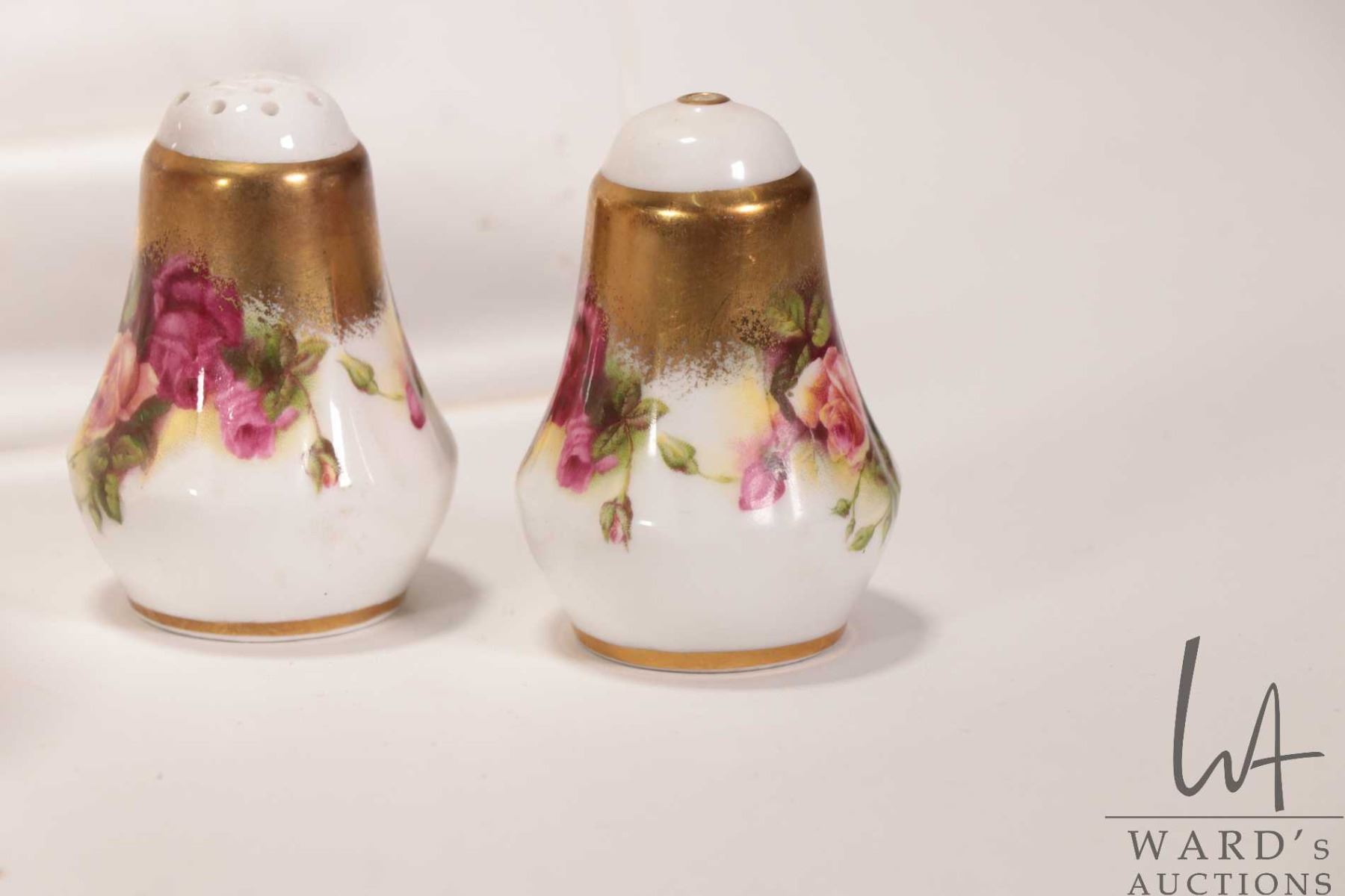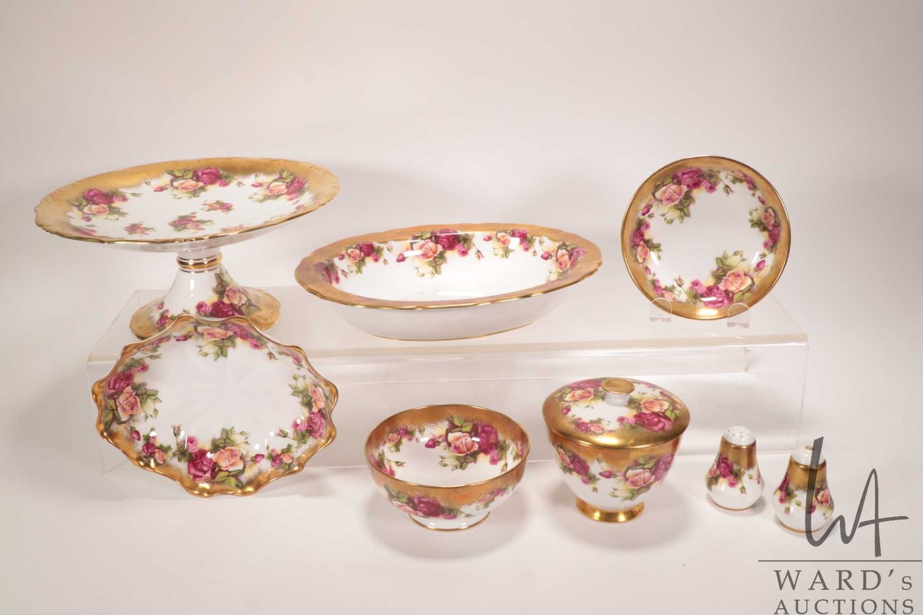 Selection of Royal Chelsea Gold Rose china including 9 1/2" diameter comport, 10" open vegetable dishes, ruffled sweet meat, lidded pot, two round dishes and two shakers