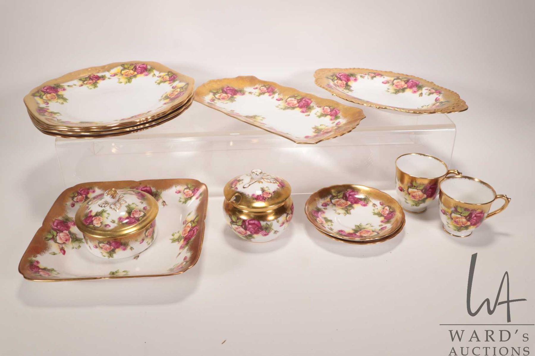Selection of Royal Chelsea Gold Rose china including four double handled 9 1/2" snack trays, square serving plate, two long serving dishes, trinket box, lidded spooner and two demitasses with saucers