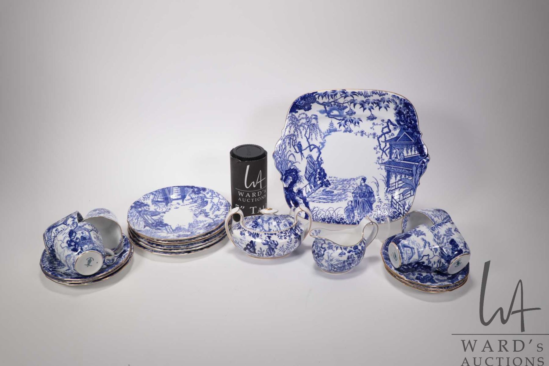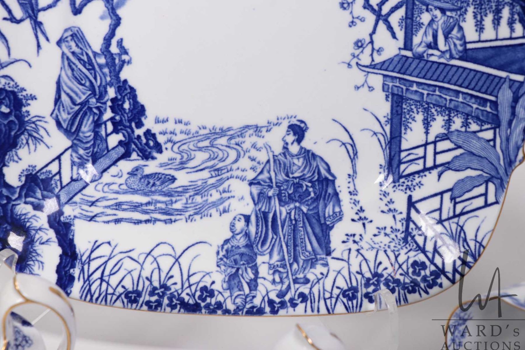 Selection of Royal Crown Derby Mikado china dinnerware including six each of 7" plates, demitasse cups and saucers plus 10" snack plate, cream and lidded sugar. NOTE: This Lot Is Not Available For Shipping. Local pickup only.