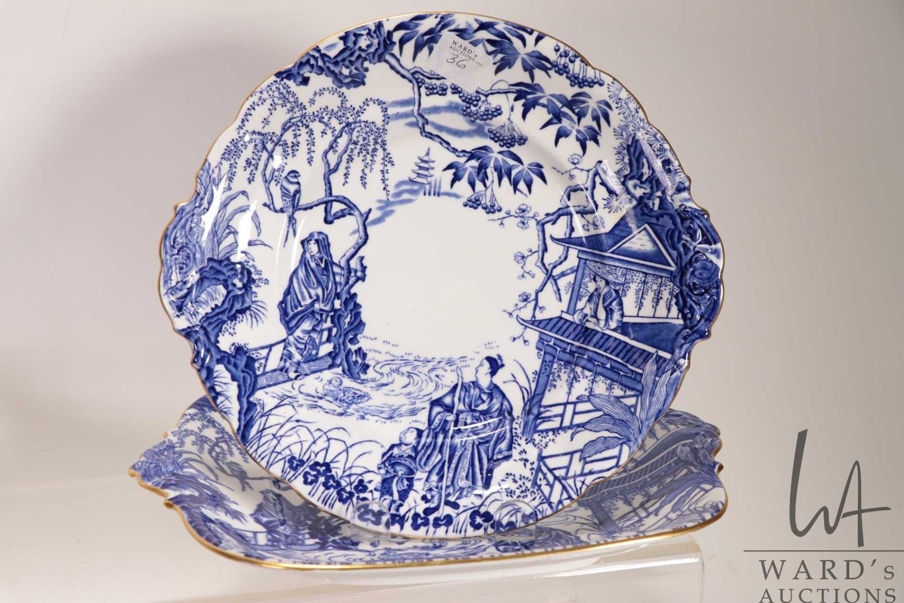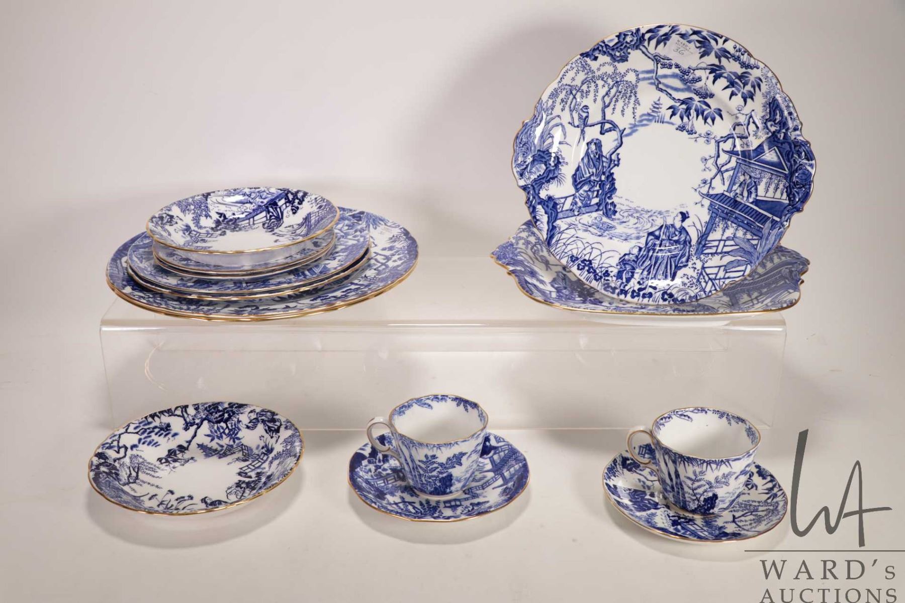 Selection of Royal Crown Derby Mikado china including two 10 1/2" dinner plates, two 8" plates, two 6"plates, two fruit bowls, two teacups and saucers, two bouillon with four drip trays, 8" X 9" square sandwich plate and a 9" round cake plate and one 5" plate