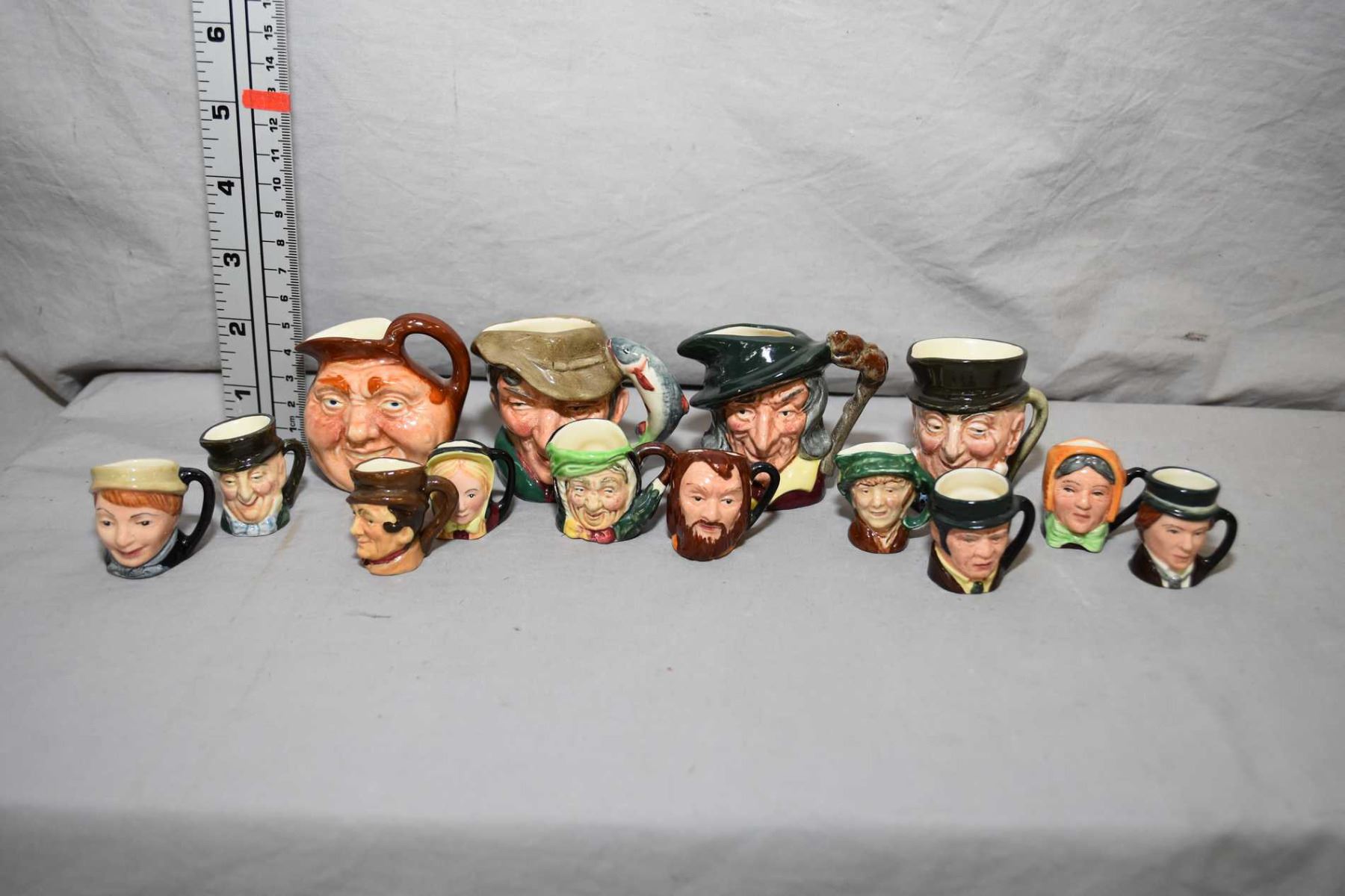 Selection of Royal Doulton character jugs including four small Pied Piper D6514, The Poacher D6515, John Barleycorn Old lad and Micawber plus ten tinies